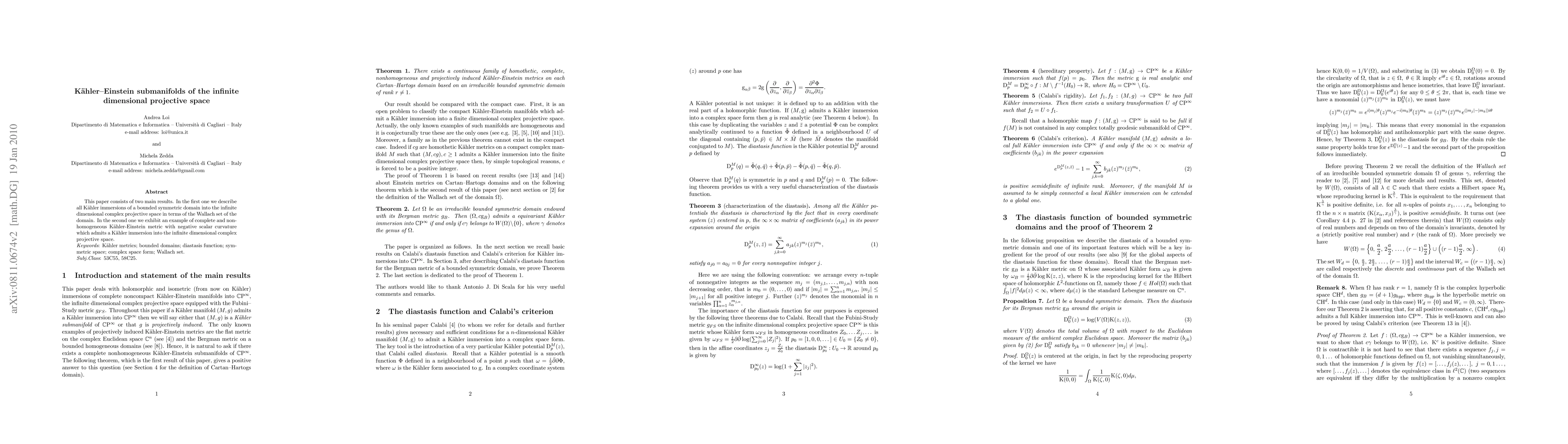 This paper identifies all Kaehler immersions of bounded symmetric domains into infinite dimensional complex projective space via the Wallach set, and presents a complete, non-homogeneous Kaehler-Einstein metric with negative scalar curvature that can be immersed into the same space.