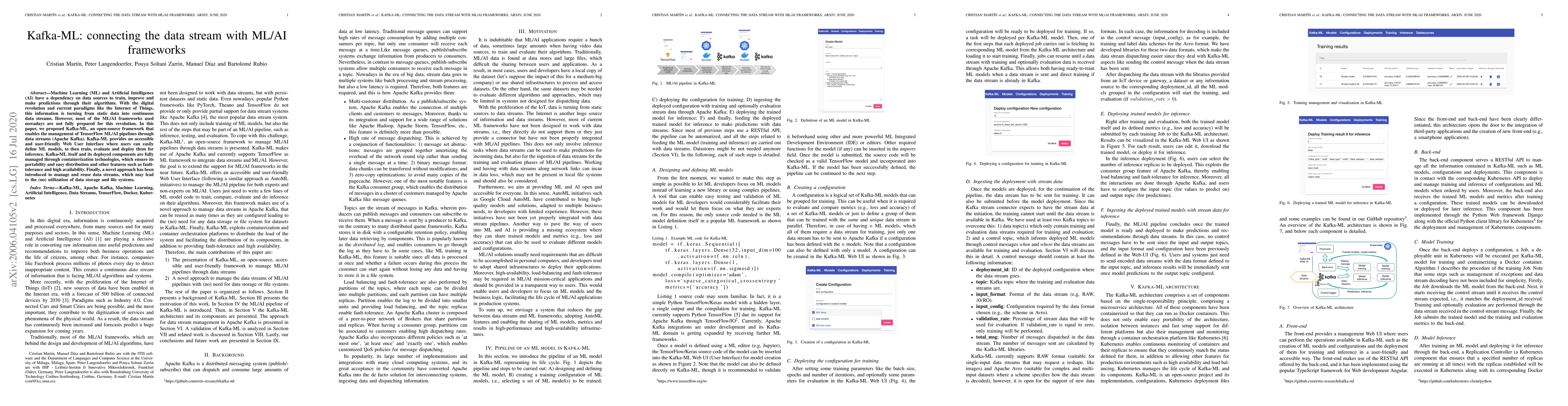 Kafka-ML is an open-source framework designed to integrate TensorFlow ML/AI pipelines with data streams via Apache Kafka, offering a user-friendly web interface for model management and deployment, while ensuring portability and fault-tolerance through containerization. It introduces a novel method for managing data streams, potentially reducing reliance on traditional data storage.