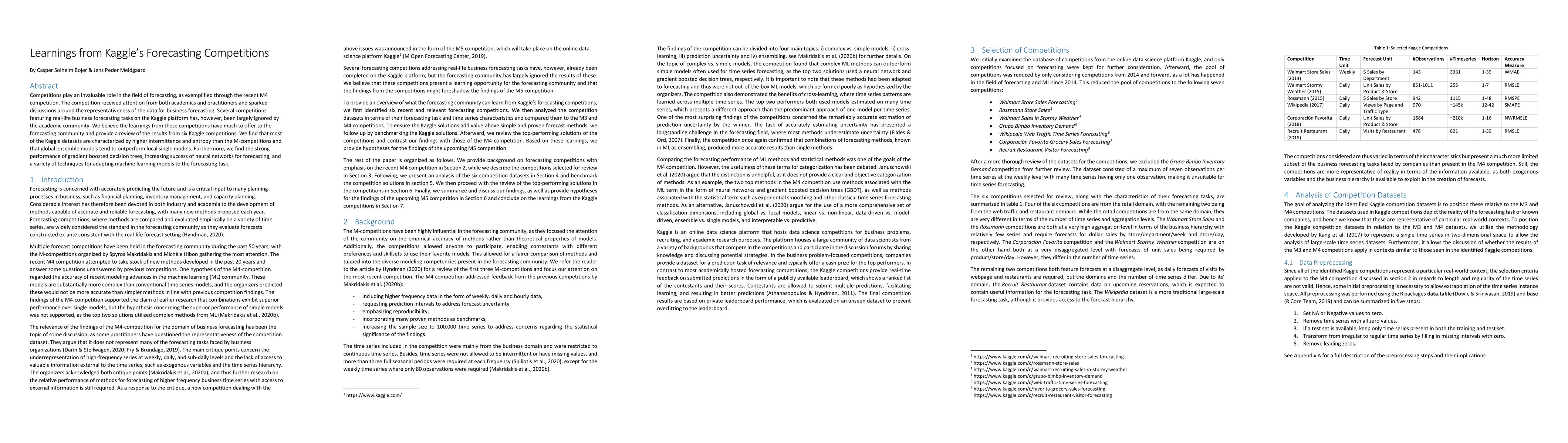 This paper reviews the results from six Kaggle forecasting competitions, highlighting that these competitions offer valuable insights for the forecasting community. It finds that Kaggle datasets often have higher intermittence and entropy, and global ensemble models generally outperform local single models, with gradient boosted decision trees and neural networks showing strong performance.