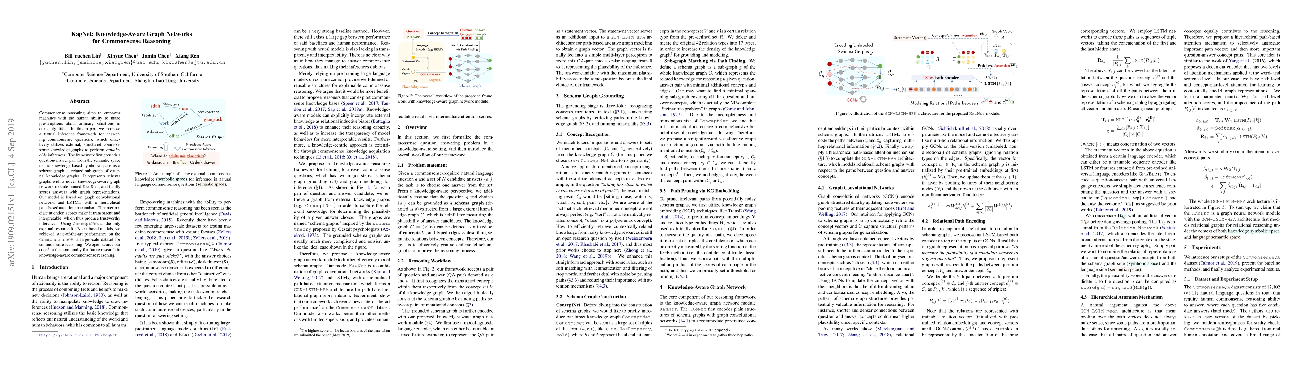 This paper introduces KagNet, a knowledge-aware graph network that leverages external commonsense knowledge graphs to perform explainable textual inferences for answering commonsense questions. The framework uses graph convolutional networks and LSTMs with a hierarchical attention mechanism to achieve state-of-the-art performance on CommonsenseQA, demonstrating transparent and interpretable inference.
