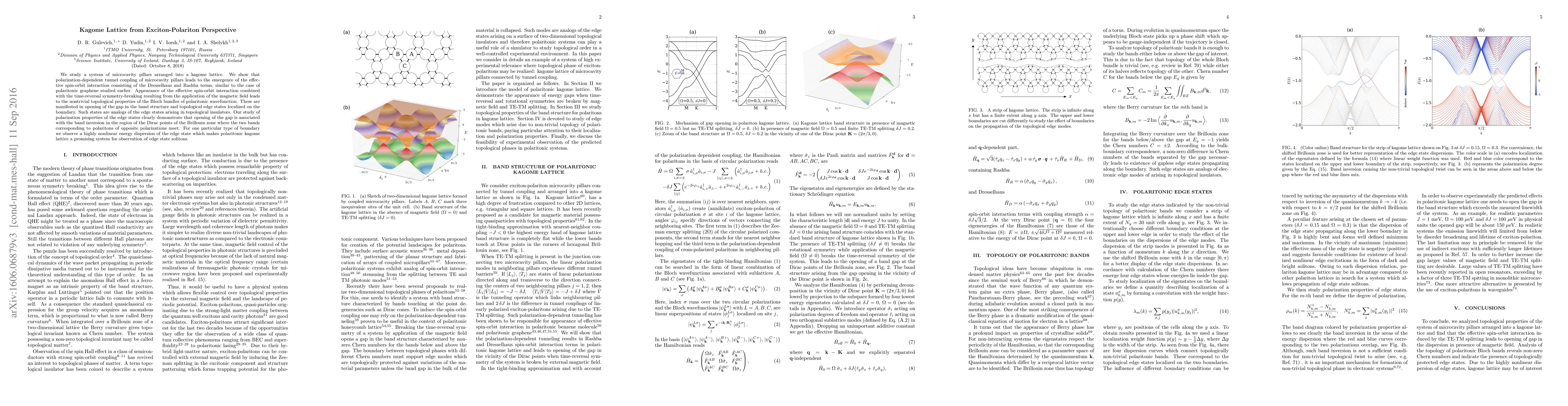 This paper investigates a kagome lattice of microcavity pillars, revealing an effective spin-orbit interaction due to polarization-dependent tunnel coupling. The study finds topological properties resulting in band gap opening and edge states, analogous to topological insulators, with potential for soliton observation.