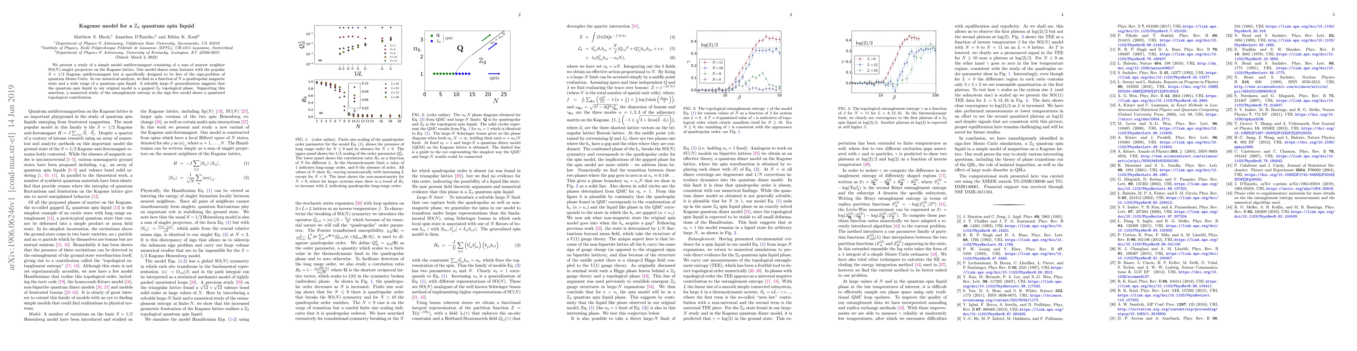 This paper studies a ${\mathbb Z}_2$ quantum spin liquid model on the Kagome lattice, free from the sign-problem, revealing a quadrupolar magnetic state and a broad quantum spin liquid phase. The large-$N$ generalization and entanglement entropy analysis support the model's quantum spin liquid as a gapped ${\mathbb Z}_2$ topological phase.