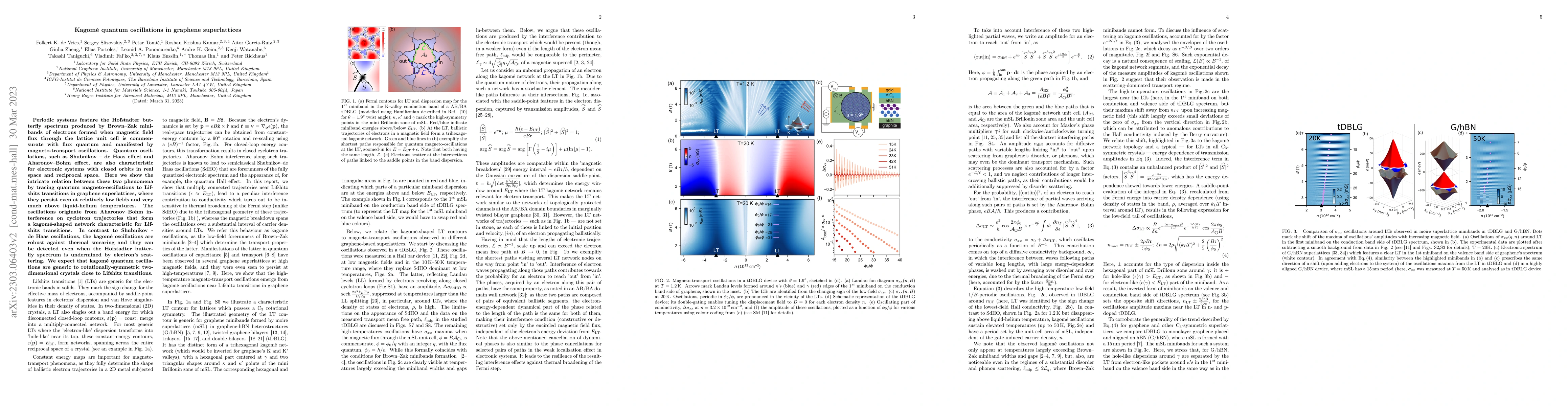 Periodic systems feature the Hofstadter butterfly spectrum produced by Brown--Zak minibands of electrons formed when magnetic field flux through the lattice unit cell is commensurate with flux quantum and manifested by magneto-transport oscillations. Quantum oscillations, such as Shubnikov -- de Haas effect and Aharonov--Bohm effect, are also characteristic for electronic systems with closed orbits in real space and reciprocal space. Here we show the intricate relation between these two phenomena by tracing quantum magneto-oscillations to Lifshitz transitions in graphene superlattices, where they persist even at relatively low fields and very much above liquid-helium temperatures. The oscillations originate from Aharonov--Bohm interference on cyclotron trajectories that form a kagom\'e-shaped network characteristic for Lifshitz transitions. In contrast to Shubnikov - de Haas oscillations, the kagom\'e oscillations are robust against thermal smearing and they can be detected even when the Hofstadter butterfly spectrum is undermined by electron's scattering. We expect that kagom\'e quantum oscillations are generic to rotationally-symmetric two-dimensional crystals close to Lifshitz transitions.
