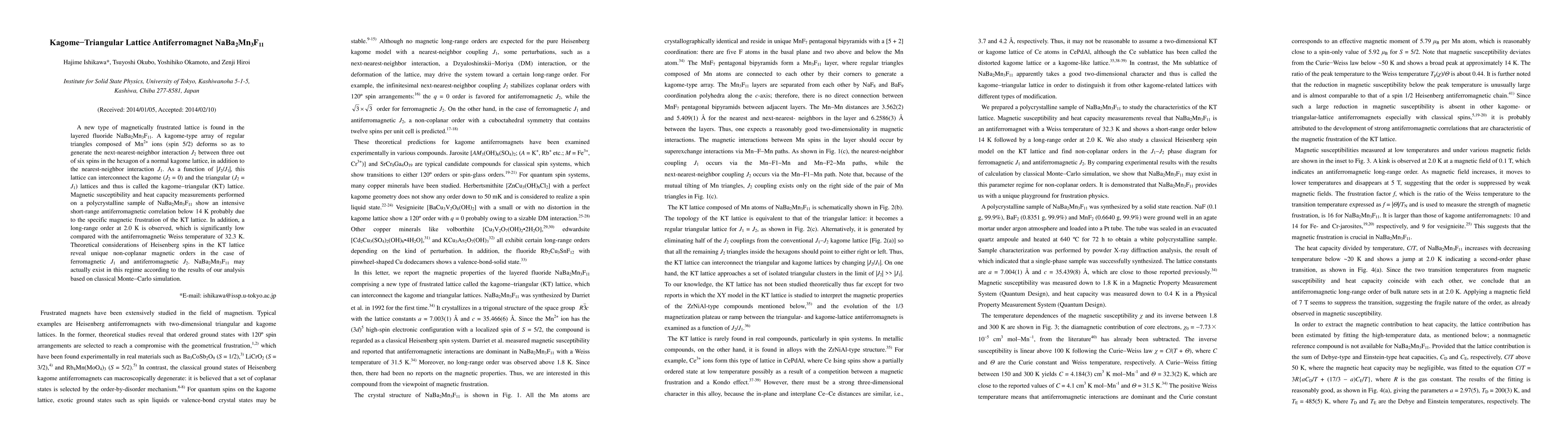 NaBa2Mn3F11 exhibits a kagome-triangular lattice with magnetic frustration due to next-nearest-neighbor interactions, leading to short-range antiferromagnetic correlations and a low-temperature long-range order. Theoretical studies suggest unique non-coplanar magnetic orders in this system.