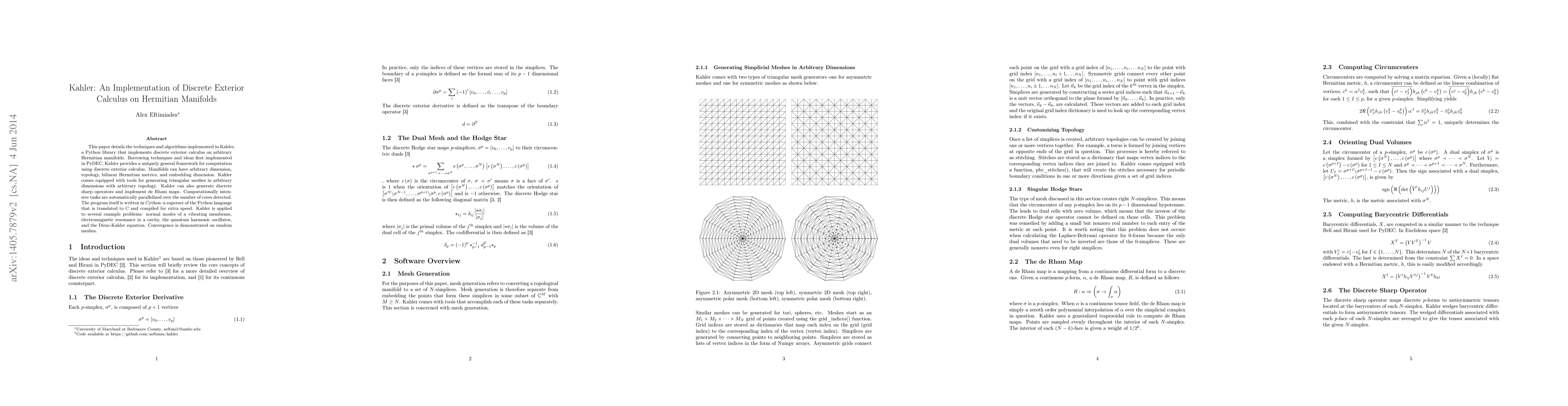 This paper details the techniques and algorithms implemented in Kahler, a Python library that implements discrete exterior calculus on arbitrary Hermitian manifolds. Borrowing techniques and ideas first implemented in PyDEC, Kahler provides a uniquely general framework for computation using discrete exterior calculus. Manifolds can have arbitrary dimension, topology, bilinear Hermitian metrics, and embedding dimension. Kahler comes equipped with tools for generating triangular meshes in arbitrary dimensions with arbitrary topology. Kahler can also generate discrete sharp operators and implement de Rham maps. Computationally intensive tasks are automatically parallelized over the number of cores detected. The program itself is written in Cython--a superset of the Python language that is translated to C and compiled for extra speed. Kahler is applied to several example problems: normal modes of a vibrating membrane, electromagnetic resonance in a cavity, the quantum harmonic oscillator, and the Dirac-Kahler equation. Convergence is demonstrated on random meshes.