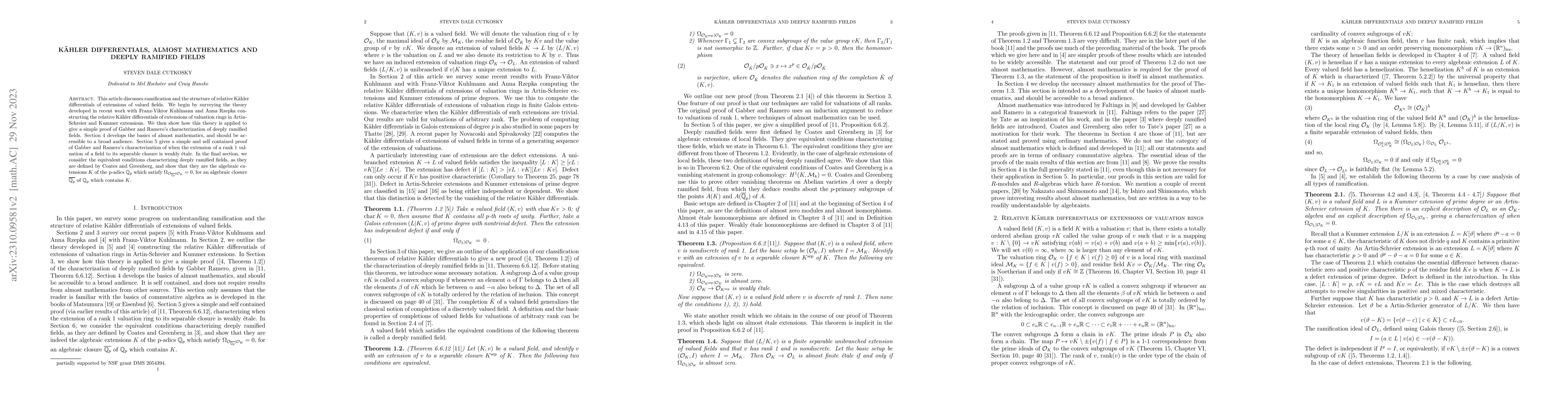 This article discusses ramification and the structure of relative K\"ahler differentials of extensions of valued fields. We begin by surveying the theory developed in recent work with Franz-Viktor Kuhlmann and Anna Rzepka constructing the relative K\"ahler differentials of extensions of valuation rings in Artin-Schreier and Kummer extensions. We then show how this theory is applied to give a simple proof of Gabber and Ramero's characterization of deeply ramified fields. Section 4 develops the basics of almost mathematics, and should be accessible to a broad audience. Section 5 gives a simple and self contained proof of Gabber and Ramero's characterization of when the extension of a rank 1 valuation of a field to its separable closure is weakly \'etale. In the final section, we consider the equivalent conditions characterizing deeply ramified fields, as they are defined by Coates and Greenberg, and show that they are the same as the conditions of Gabber Ramero for local fields.