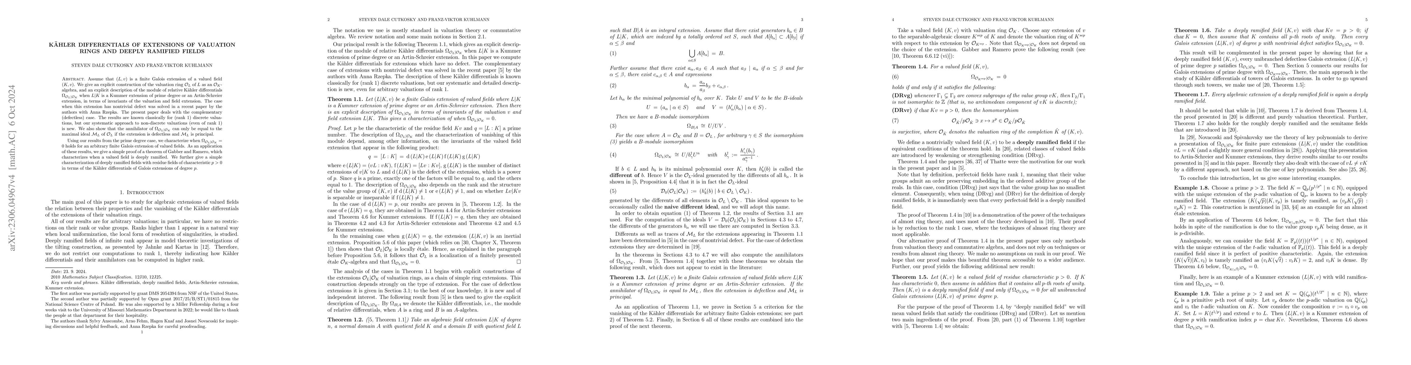 This paper constructs the valuation ring $\mathcal O_L$ of a Kummer or Artin-Schreier extension $L|K$ as an $\mathcal O_K$-algebra and describes the module of relative Kähler differentials $\Omega_{\mathcal O_L|\mathcal O_K}$ in terms of valuation invariants. It also provides a characterization of deeply ramified fields using Kähler differentials.