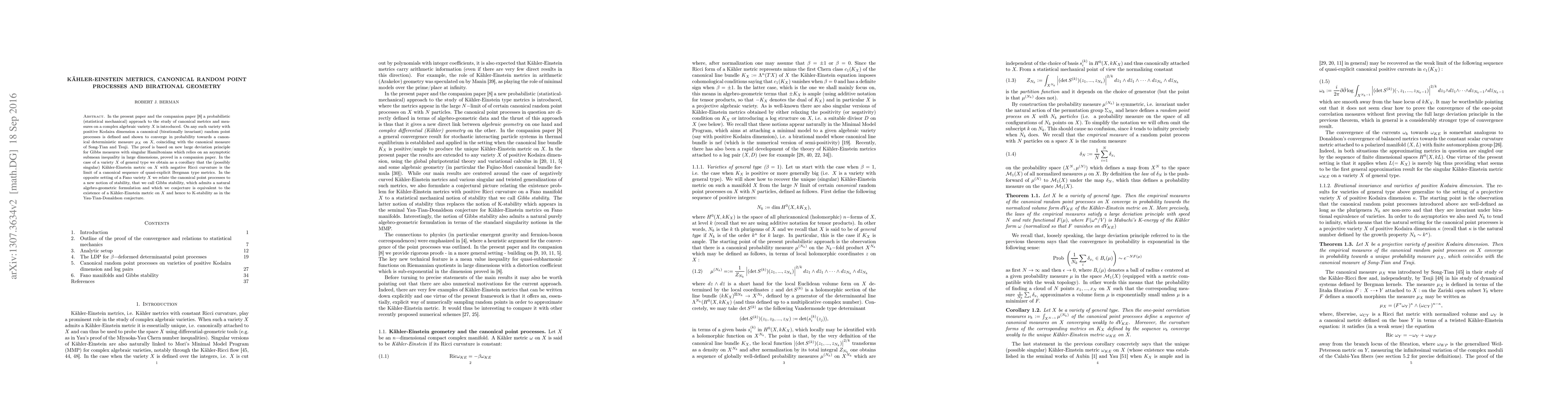 In the present paper and the companion paper [8] a probabilistic (statistical mechanical) approach to the study of canonical metrics and measures on a complex algebraic variety X is introduced. On any such variety with positive Kodaira dimension a canonical (birationally invariant) random point processes is defined and shown to converge in probability towards a canonical deterministic measure on X, coinciding with the canonical measure of Song-Tian and Tsuji. The proof is based on new large deviation principle for Gibbs measures with singular Hamiltonians which relies on an asymptotic submean inequality in large dimensions, proved in a companion paper. In the case of a variety X of general type we obtain as a corollary that the (possibly singular) K\"ahler-Einstein metric on X with negative Ricci curvature is the limit of a canonical sequence of quasi-explicit Bergman type metrics. In the opposite setting of a Fano variety X we relate the canonical point processes to a new notion of stability, that we call Gibbs stability, which admits a natural algebro-geometric formulation and which we conjecture is equivalent to the existence of a K\"ahler-Einstein metric on X and hence to K-stability as in the Yau-Tian-Donaldson conjecture.