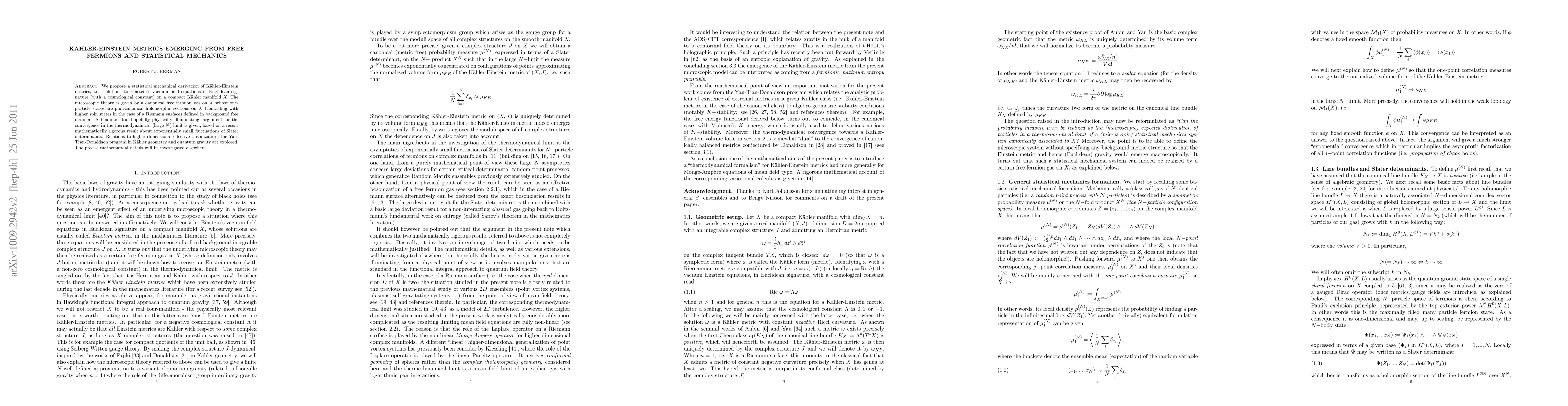 We propose a statistical mechanical derivation of Kahler-Einstein metrics, i.e. solutions to Einstein's vacuum field equations in Euclidean signature (with a cosmological constant) on a compact Kahler manifold X. The microscopic theory is given by a canonical free fermion gas on X whose one-particle states are pluricanonical holomorphic sections on X (coinciding with higher spin states in the case of a Riemann surface). A heuristic, but hopefully physically illuminating, argument for the convergence in the thermodynamical (large N) limit is given, based on a recent mathematically rigorous result about exponentially small fluctuations of Slater determinants. Relations to effective bosonization and the Yau-Tian-Donaldson program in Kahler geometry are pointed out. The precise mathematical details will be investigated elsewhere.