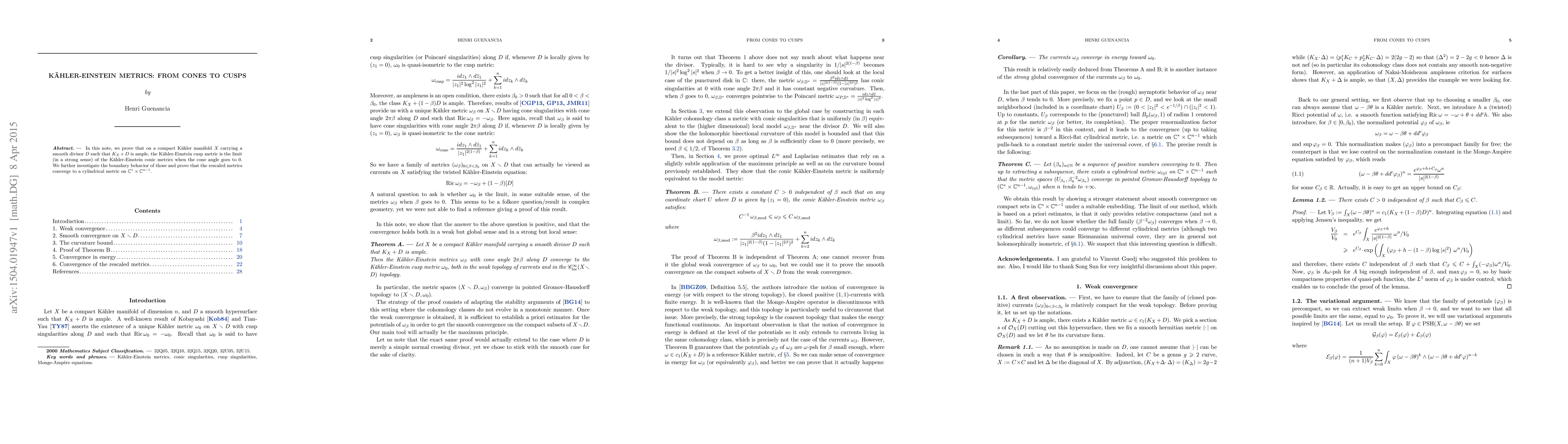 In this note, we prove that on a compact K\"ahler manifold $X$ carrying a smooth divisor $D$ such that $K_X+D$ is ample, the K\"ahler-Einstein cusp metric is the limit (in a strong sense) of the K\"ahler-Einstein conic metrics when the cone angle goes to $0$. We further investigate the boundary behavior of those and prove that the rescaled metrics converge to a cylindrical metric on $\mathbb C^*\times \mathbb C^{n-1}$.