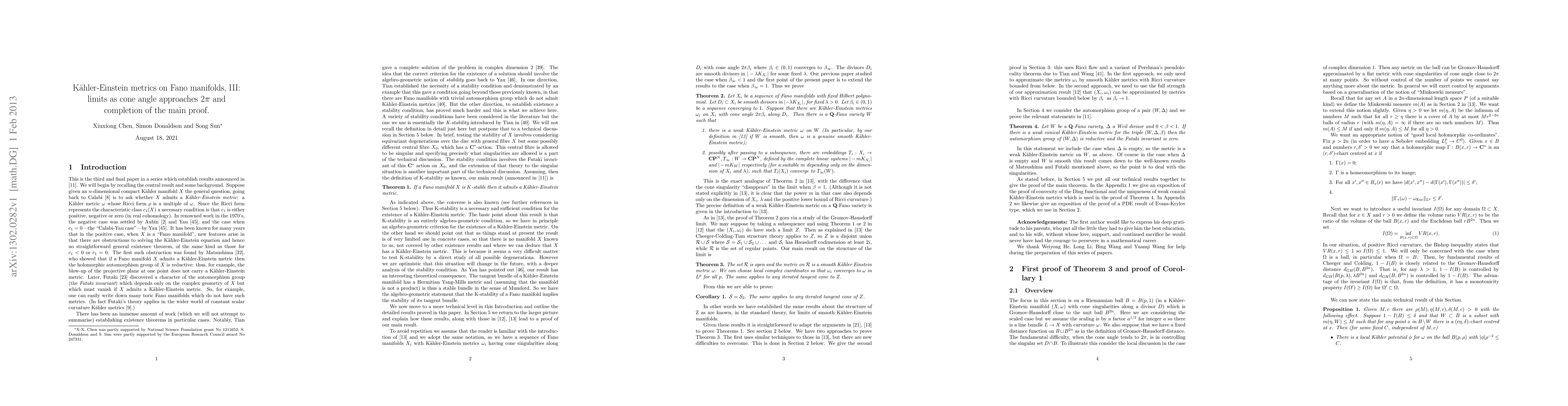 This is the third and final paper in a series which establish results announced in arXiv:1210.7494. In this paper we consider the Gromov-Hausdorff limits of metrics with cone singularities in the case when the limiting cone angle approaches 2\pi. We also put all our technical results together to complete the proof of the main theorem that if a K-stable Fano manifold admits a Kahler-Einstein metric.