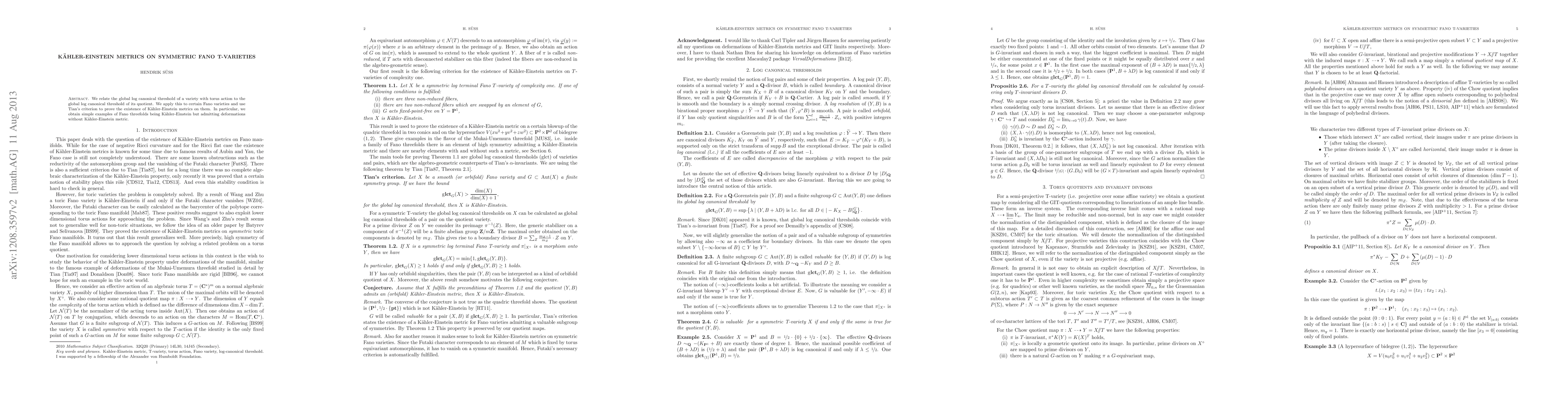 This paper connects the global log canonical threshold of symmetric Fano T-varieties to that of their quotients, using Tian's criterion to establish the existence of Kahler-Einstein metrics on these varieties, and provides examples of Fano threefolds that are Kahler-Einstein but allow non-Kahler-Einstein deformations.