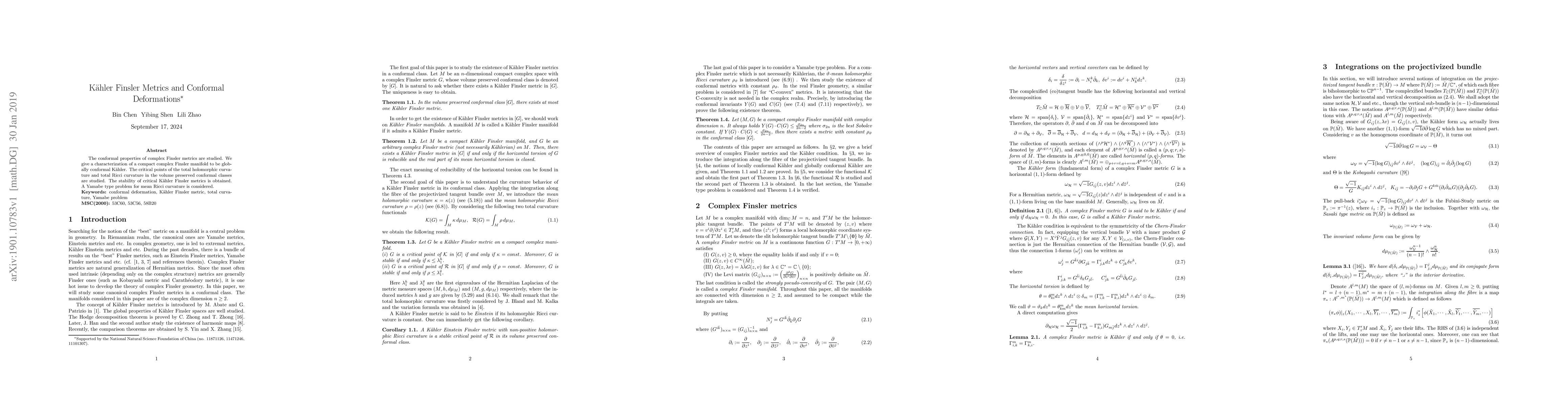 This paper characterizes compact complex Finsler manifolds that are globally conformal Kähler and explores the critical points of holomorphic and Ricci curvatures within volume-preserved conformal classes. It also investigates the stability of critical Kähler Finsler metrics and addresses a Yamabe type problem for mean Ricci curvature.