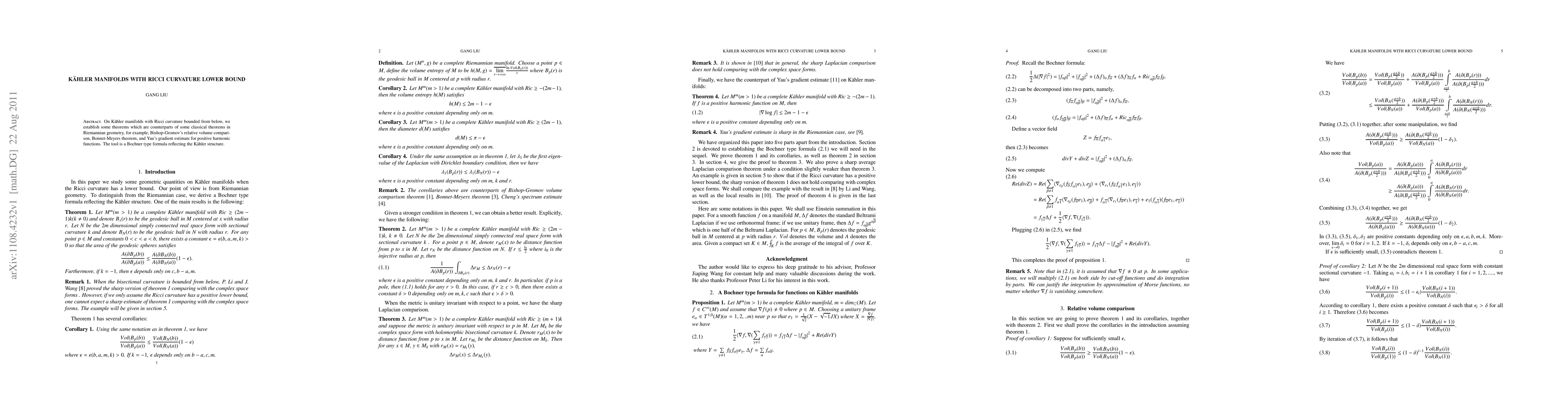 This paper establishes theorems for Kahler manifolds with a lower bound on Ricci curvature, analogous to classical theorems in Riemannian geometry, using a Bochner type formula that leverages the Kahler structure. Key results include the Bishop-Gromov relative volume comparison, Bonnet-Meyers theorem, and Yau's gradient estimate for positive harmonic functions.