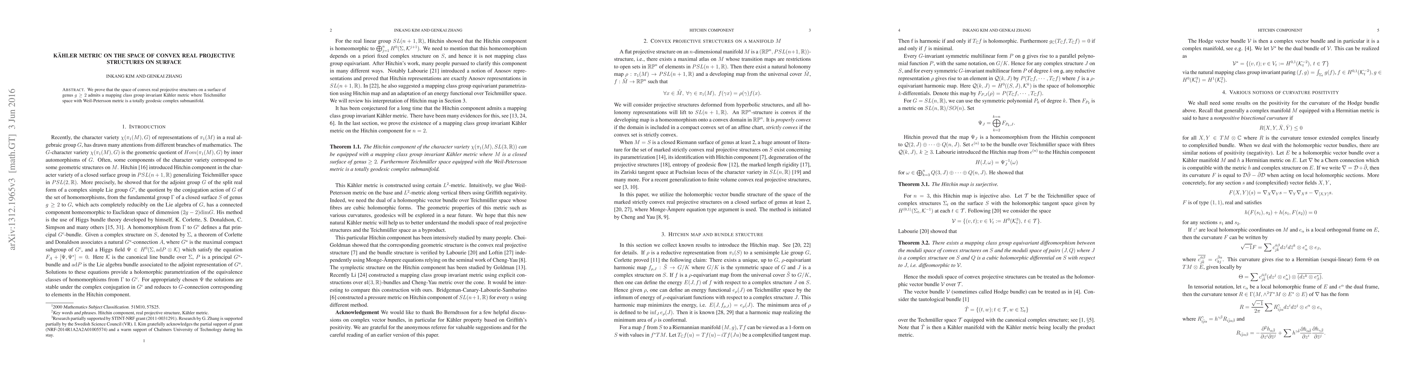 Summary: The paper proves the existence of a Kähler metric on the space of convex real projective structures for surfaces of genus $g\ge 2$, invariant under the mapping class group, with Teichmüller space embedded as a totally geodesic submanifold.