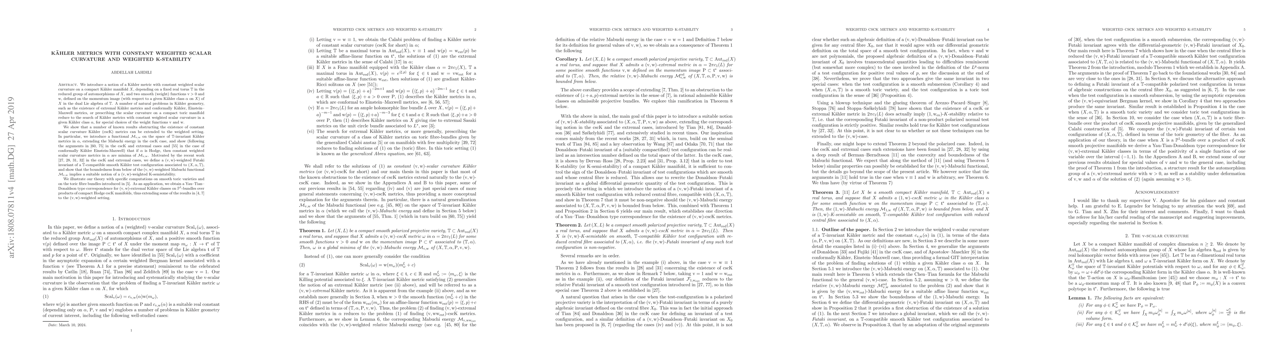 This paper introduces Kähler metrics with constant weighted scalar curvature on compact Kähler manifolds and extends existing obstructions to their existence. It extends the Mabuchi energy functional and shows that under certain conditions, these metrics minimize this functional, linking them to weighted K-stability.