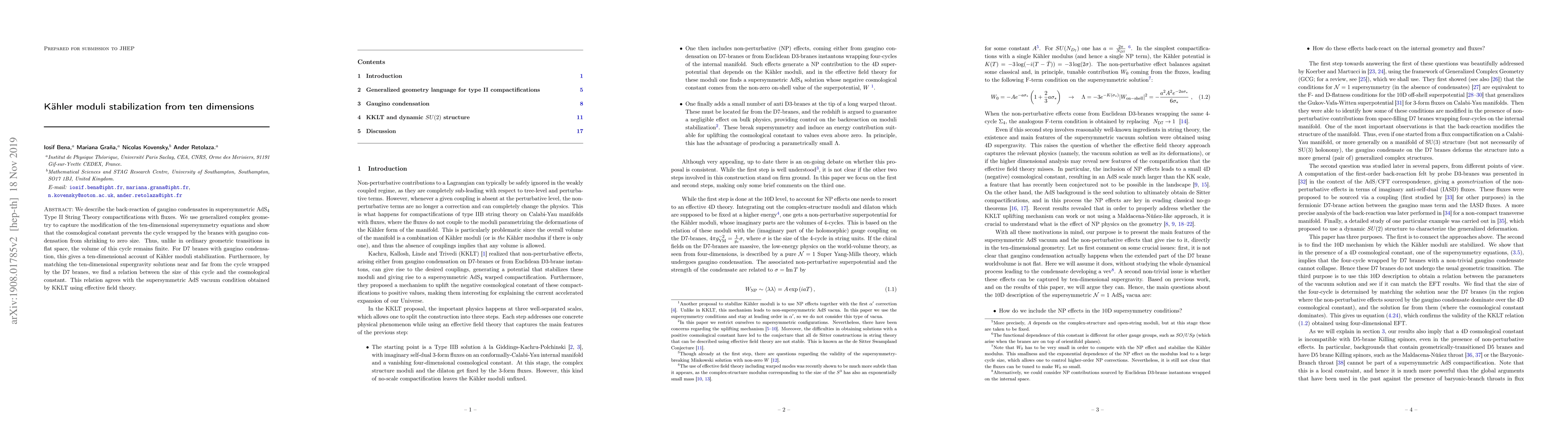 We describe the back-reaction of gaugino condensates in supersymmetric AdS$_4$ Type II String Theory compactifications with fluxes. We use generalized complex geometry to capture the modification of the ten-dimensional supersymmetry equations and show that the cosmological constant prevents the cycle wrapped by the branes with gaugino condensation from shrinking to zero size. Thus, unlike in ordinary geometric transitions in flat space, the volume of this cycle remains finite. For D7 branes with gaugino condensation, this gives a ten-dimensional account of K\"ahler moduli stabilization. Furthermore, by matching the ten-dimensional supergravity solutions near and far from the cycle wrapped by the D7 branes, we find a relation between the size of this cycle and the cosmological constant. This relation agrees with the supersymmetric AdS vacuum condition obtained by KKLT using effective field theory.