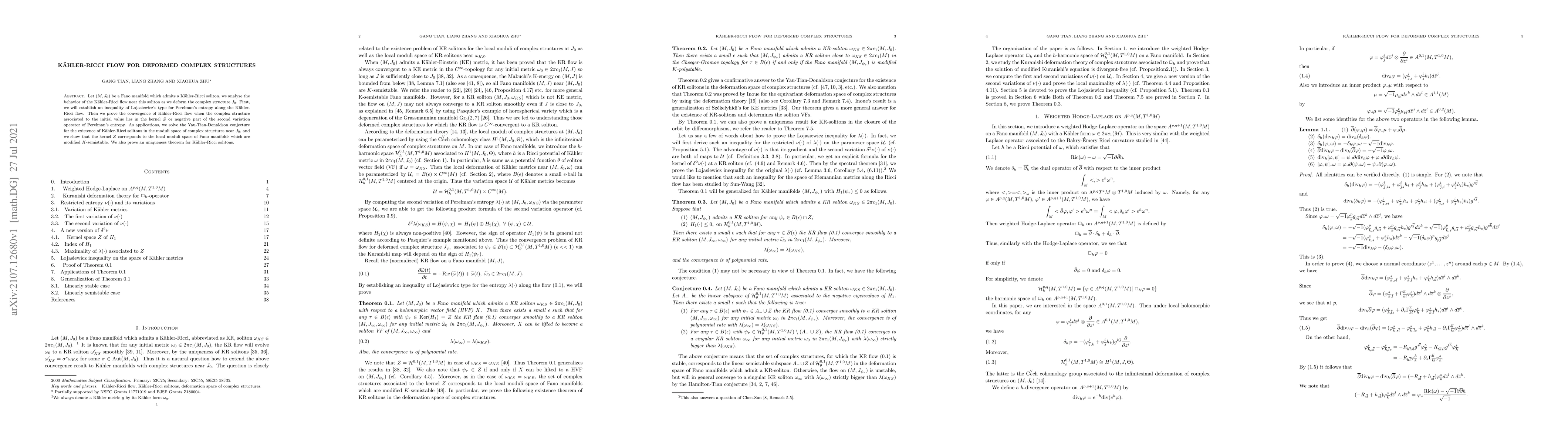Let $(M,J_0)$ be a Fano manifold which admits a K\"ahler-Ricci soliton, we analyze the behavior of the K\"ahler-Ricci flow near this soliton as we deform the complex structure $J_0$. First, we will establish an inequality of Lojasiewicz's type for Perelman's entropy along the K\"ahler-Ricci flow. Then we prove the convergence of K\"ahler-Ricci flow when the complex structure associated to the initial value lies in the kernel $Z$ or negative part of the second variation operator of Perelman's entropy. As applications, we solve the Yau-Tian-Donaldson conjecture for the existence of K\"ahler-Ricci solitons in the moduli space of complex structures near $J_0$, and we show that the kernel $Z$ corresponds to the local moduli space of Fano manifolds which are modified $K$-semistable. We also prove an uniqueness theorem for K\"ahler-Ricci solitons.