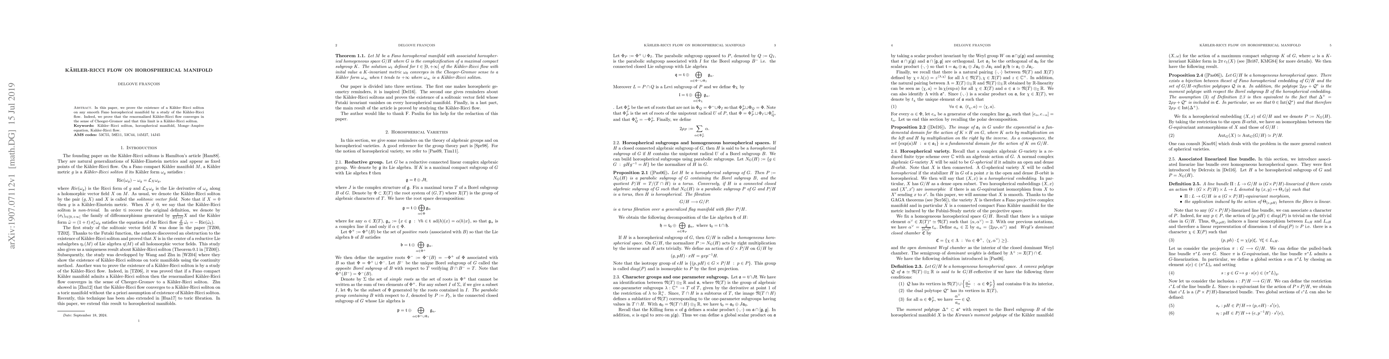 In this paper, we prove the existence of a Kahler Ricci soliton on any smooth Fano horospherical manifold by a study of the Kahler-Ricci flow. Indeed, we prove that the renormalized Kahler Ricci flow converges in the sense of Cheeger Gromov and that this limit is a Kahler-Ricci soliton.