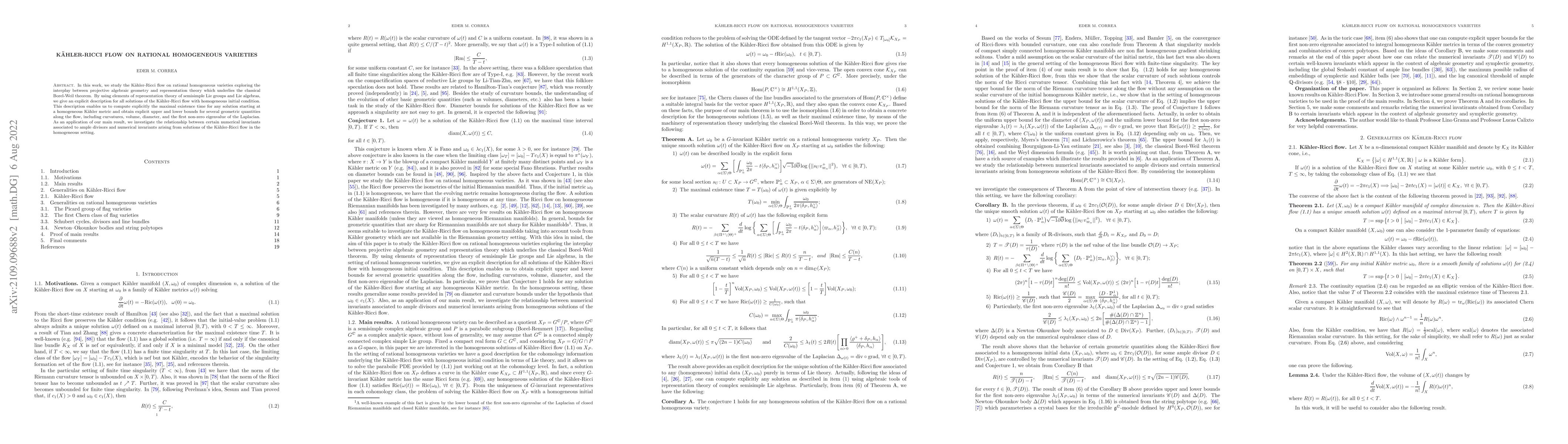 This paper explores the Kähler-Ricci flow on rational homogeneous varieties, utilizing representation theory to describe solutions explicitly. It computes maximal existence times and bounds for geometric quantities, and relates the flow's numerical invariants to those from ample divisors, providing constraints for symplectic embeddings and multiplier ideal sheaves.