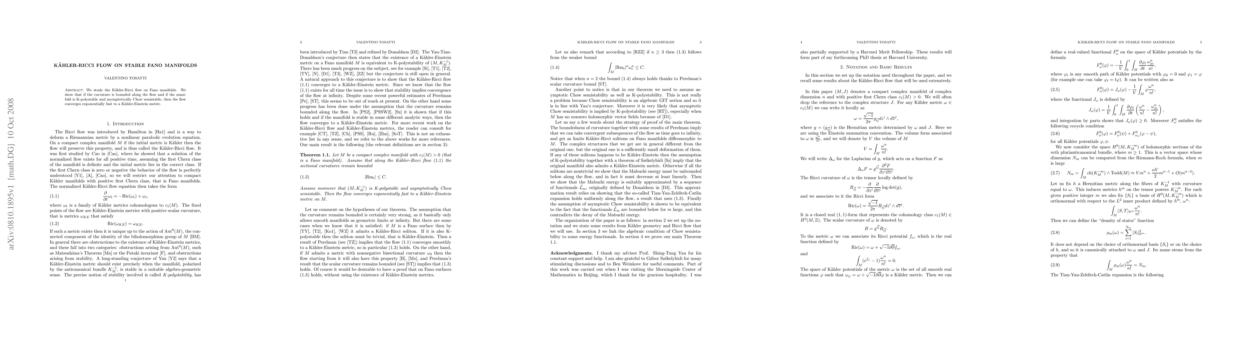 Summary: This paper demonstrates that the Kahler-Ricci flow on stable Fano manifolds converges exponentially fast to a Kahler-Einstein metric when the curvature remains bounded and the manifold exhibits K-polystability and asymptotic Chow semistability.