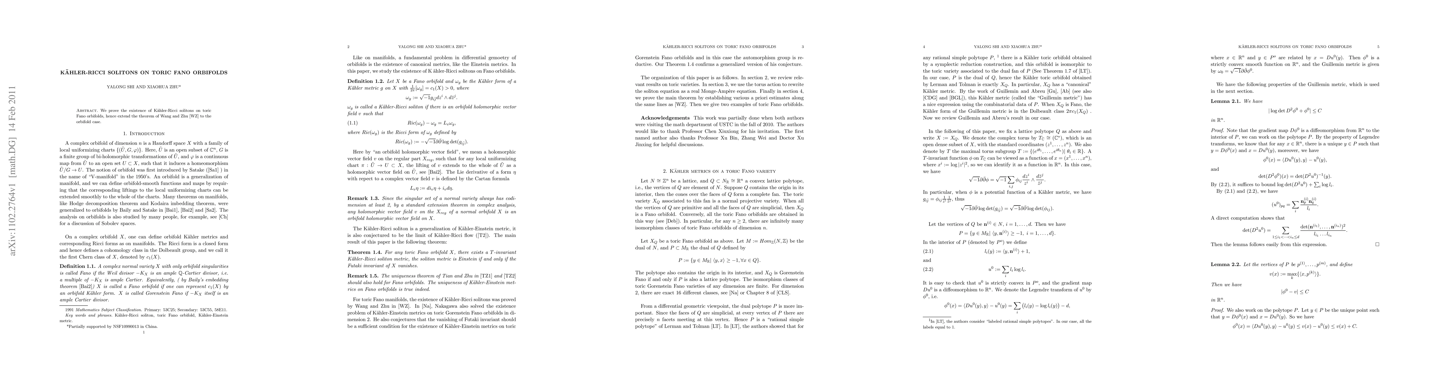Summary: This paper proves the existence of Kähler-Ricci solitons on toric Fano orbifolds, extending the theorem previously established by Wang and Zhu for the classical case to the orbifold setting.
