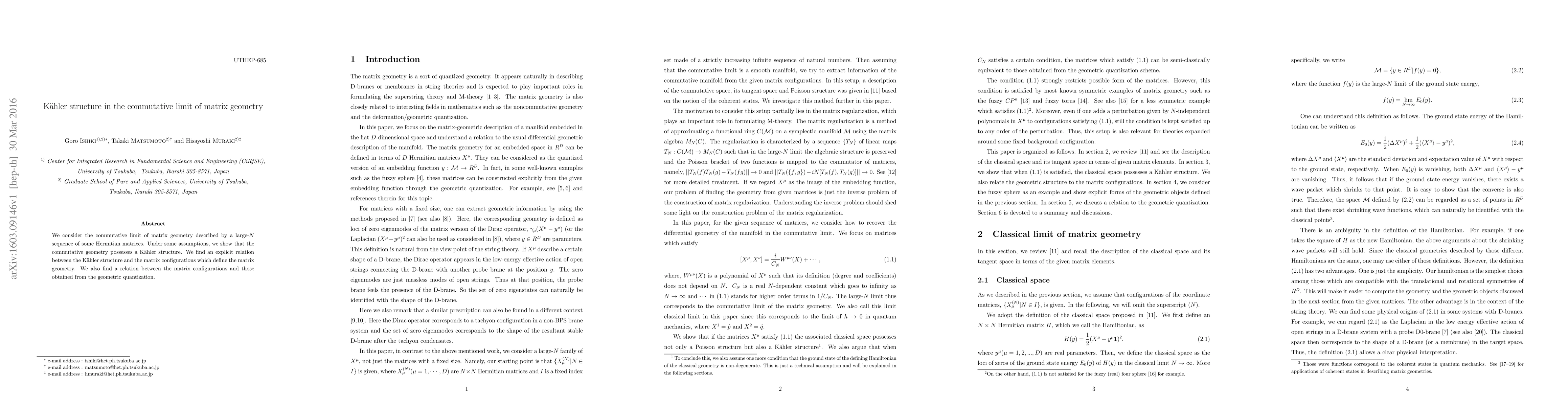 This paper demonstrates that the commutative limit of matrix geometry, derived from a large-$N$ sequence of Hermitian matrices, exhibits a Kähler structure. It establishes an explicit connection between this Kähler structure and the specific matrix configurations defining the geometry, as well as relating these configurations to those from geometric quantization.