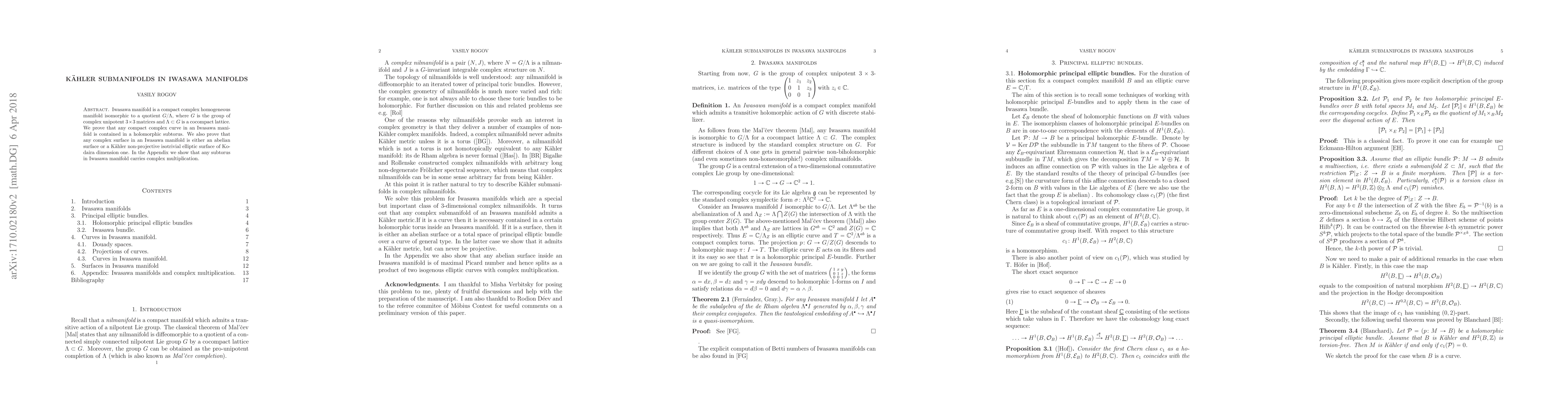 This paper proves that compact complex curves in Iwasawa manifolds are contained in holomorphic tori, and that Kähler surfaces are either abelian surfaces or non-projective isotrivial elliptic surfaces. An appendix demonstrates that complex tori in these manifolds possess complex multiplication.