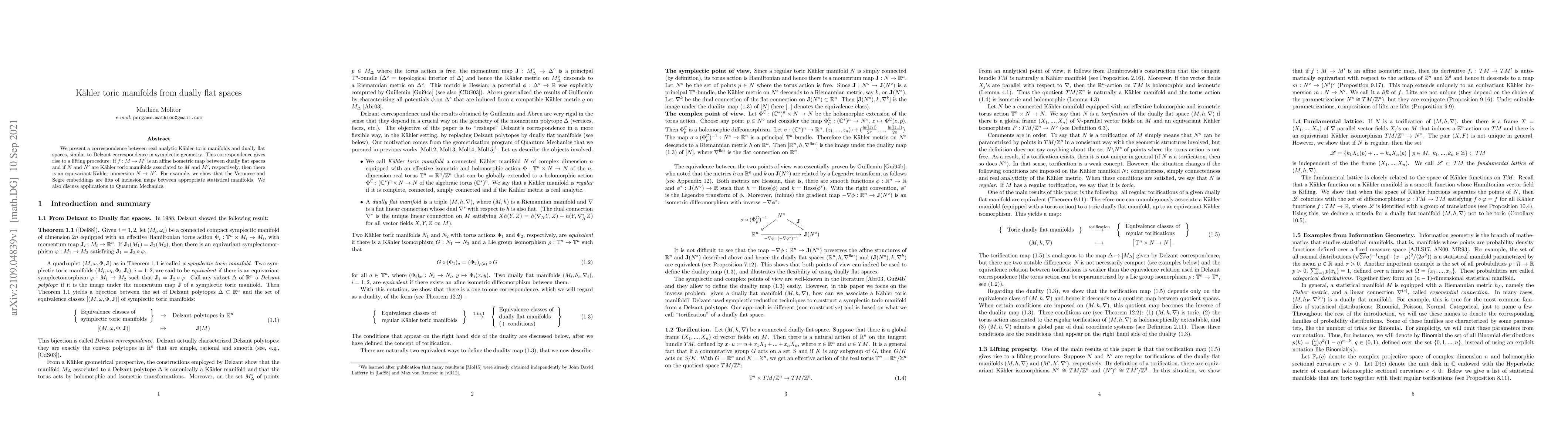 We present a correspondence between real analytic K\"{a}hler toric manifolds and dually flat spaces, similar to Delzant correspondence in symplectic geometry. This correspondence gives rise to a lifting procedure: if $f:M\to M'$ is an affine isometric map between dually flat spaces and if $N$ and $N'$ are K\"{a}hler toric manifolds associated to $M$ and $M'$, respectively, then there is an equivariant K\"{a}hler immersion $N\to N'$. For example, we show that the Veronese and Segre embeddings are lifts of inclusion maps between appropriate statistical manifolds. We also discuss applications to Quantum Mechanics.