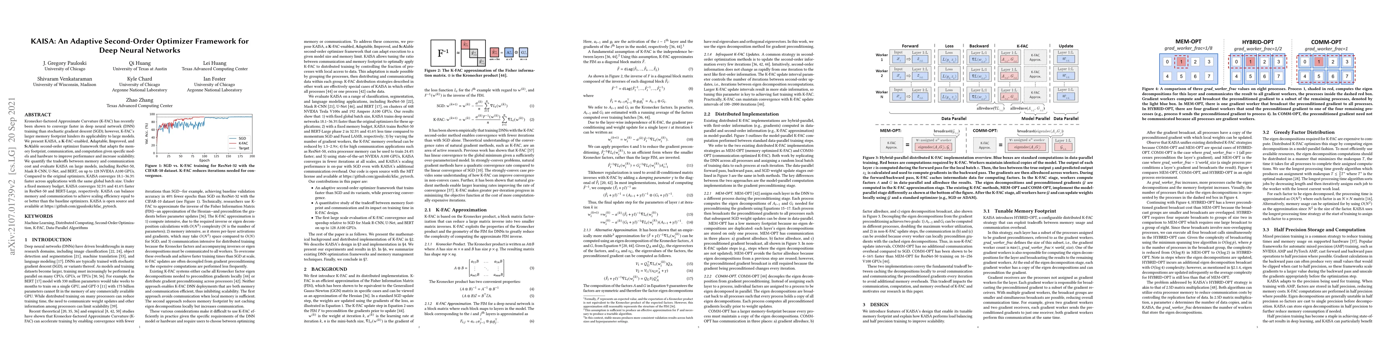 KAISA is an adaptive second-order optimizer framework designed to enhance the training of deep neural networks by improving the scalability and performance of Kronecker-factored Approximate Curvature (K-FAC). It effectively balances memory and communication costs, achieving faster convergence rates across various large models and hardware configurations.