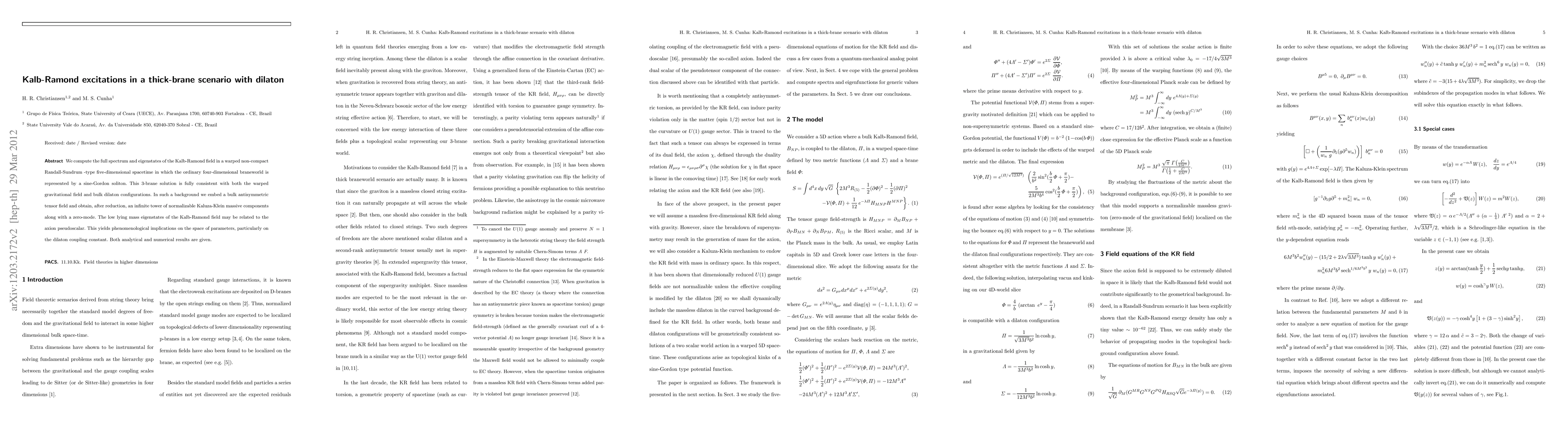 This paper investigates the spectrum and eigenstates of the Kalb-Ramond field in a thick-brane model with a dilaton in a five-dimensional warped spacetime. It finds an infinite tower of massive components and a zero-mode, with implications for the axion pseudoscalar and dilaton coupling constant.
