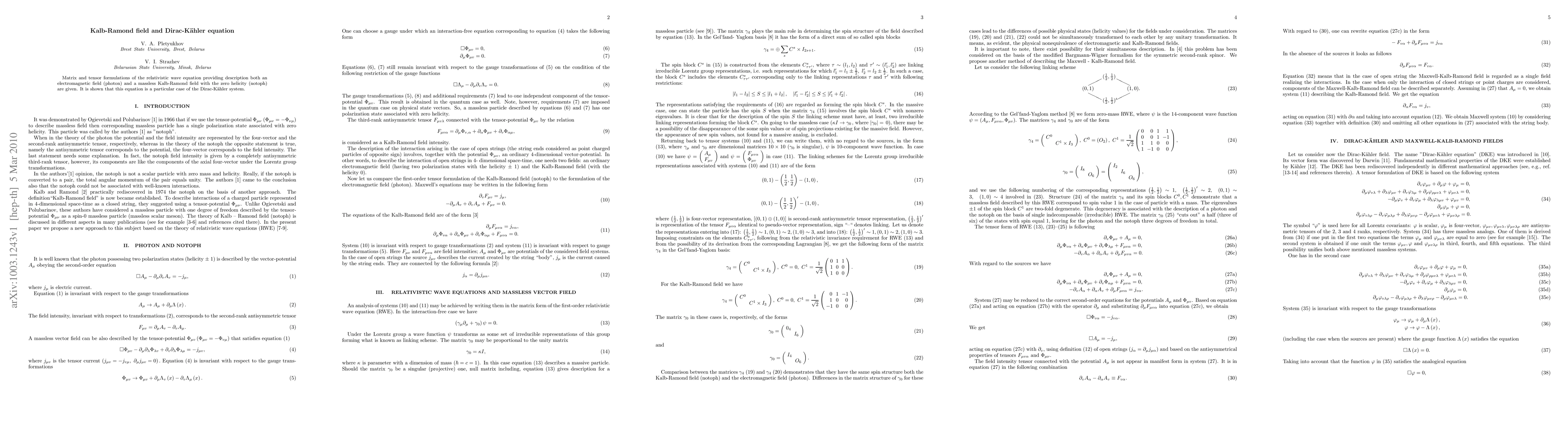 Matrix and tensor formulations of the relativistic wave equation providing description both an electromagnetic field (photon) and a massless Kalb-Ramond field with the zero helicity (notoph) are given. It is shown that this equation is a particular case of the Dirac-Kahler system.