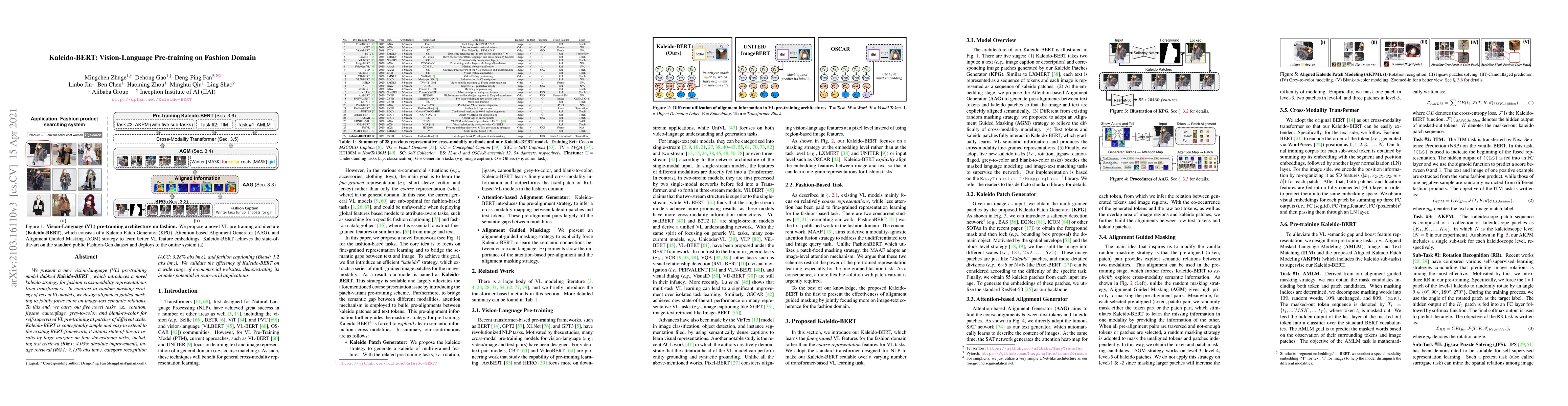Kaleido-BERT is a novel vision-language pre-training model designed for fashion domain applications, employing a kaleido strategy for better image-text alignment. It achieves state-of-the-art results across multiple fashion-related tasks, showing significant improvements in text and image retrieval, category recognition, and fashion captioning.