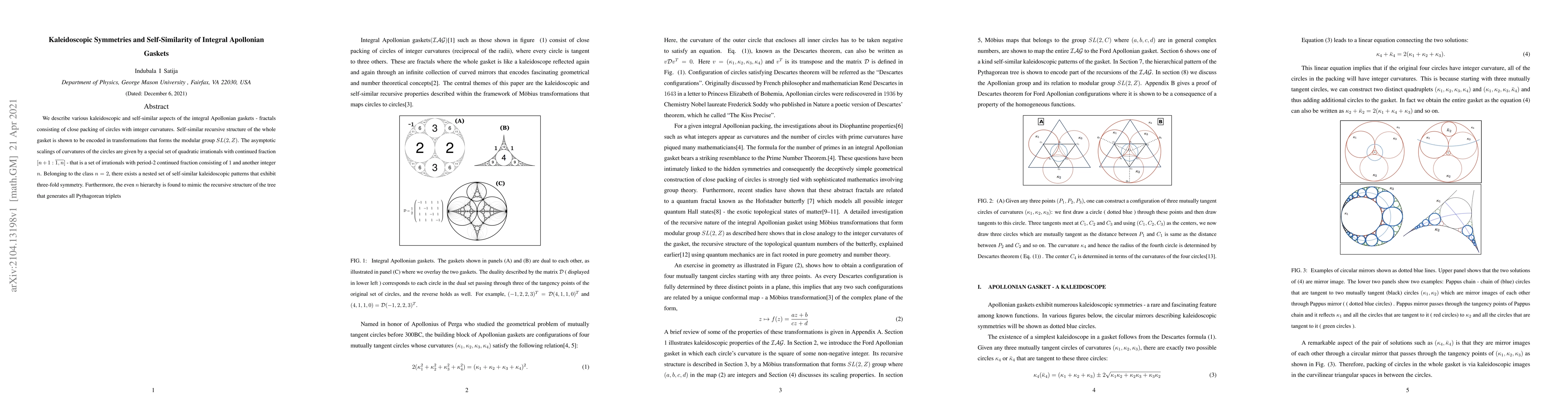 This paper explores the kaleidoscopic symmetries and self-similarity of integral Apollonian gaskets, revealing their recursive structure encoded in modular group transformations. The paper also identifies a special set of quadratic irrationals defining the asymptotic scaling of curvatures and highlights a nested self-similar pattern with three-fold symmetry.