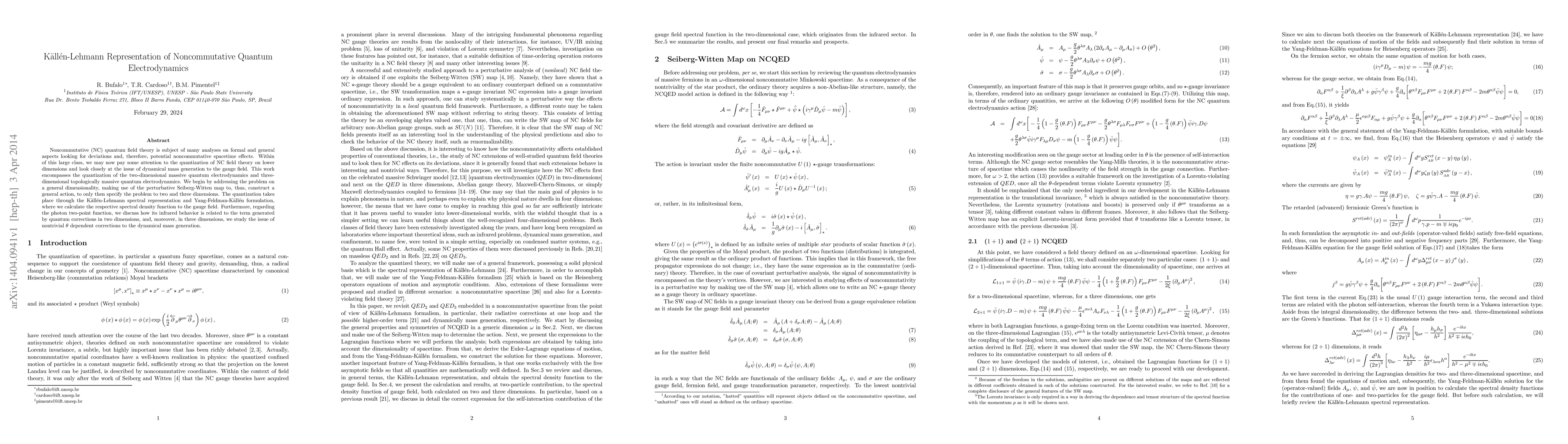 This paper investigates the quantization of noncommutative quantum electrodynamics in lower dimensions using the K\"all\'en-Lehmann representation. It focuses on dynamical mass generation in two-dimensional massive and three-dimensional topologically massive quantum electrodynamics, analyzing the infrared behavior of the photon two-point function and the impact of {\theta}-dependent corrections on mass generation.