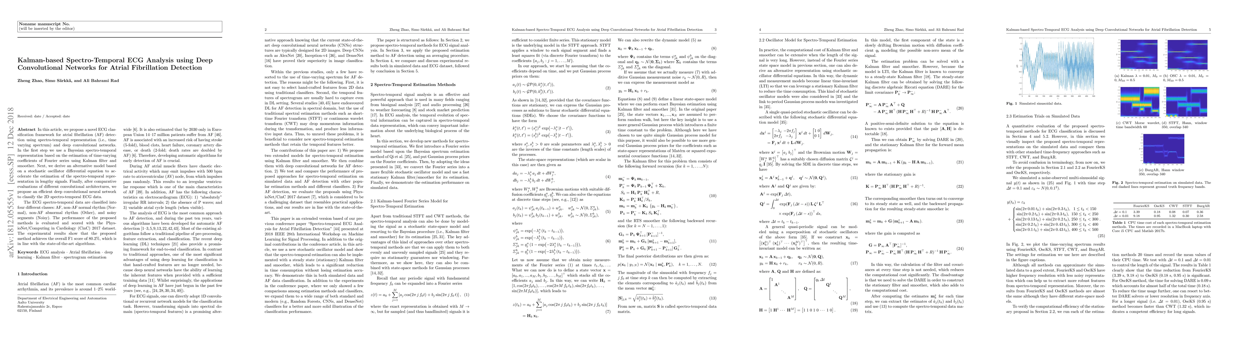 This paper proposes a novel ECG classification framework for atrial fibrillation detection using deep convolutional networks and spectro-temporal representation. It employs Kalman filtering for time-varying spectrum estimation and a stochastic oscillator model for efficient signal processing, followed by a deep convolutional neural network for classification, achieving an F1 score of 80.2% on the CinC 2017 dataset.