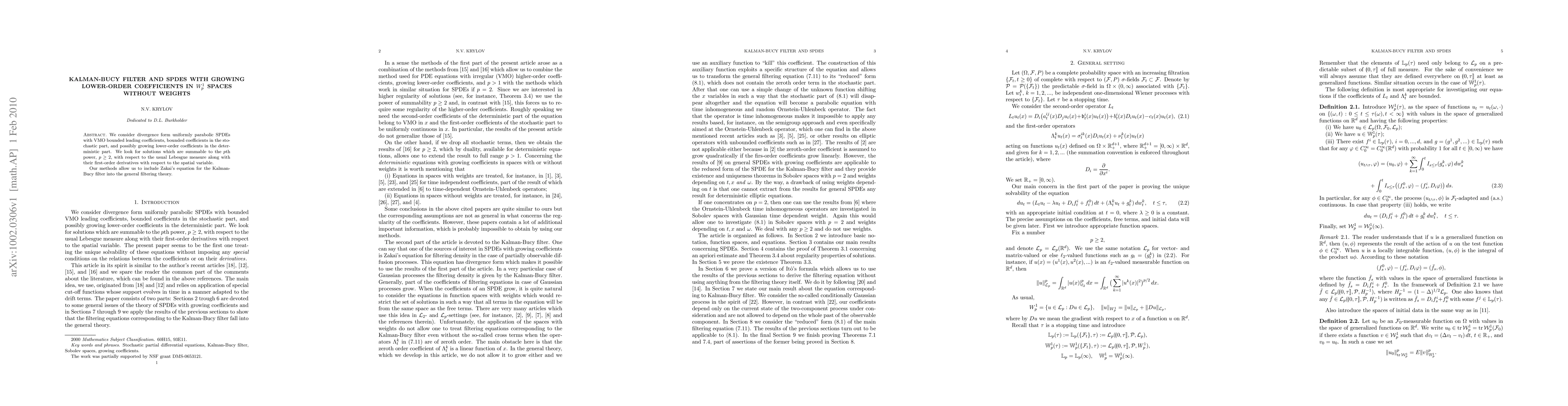 We consider divergence form uniformly parabolic SPDEs with VMO bounded leading coefficients, bounded coefficients in the stochastic part, and possibly growing lower-order coefficients in the deterministic part. We look for solutions which are summable to the $p$th power, $p\geq2$, with respect to the usual Lebesgue measure along with their first-order derivatives with respect to the spatial variable. Our methods allow us to include Zakai's equation for the Kalman-Bucy filter into the general filtering theory.