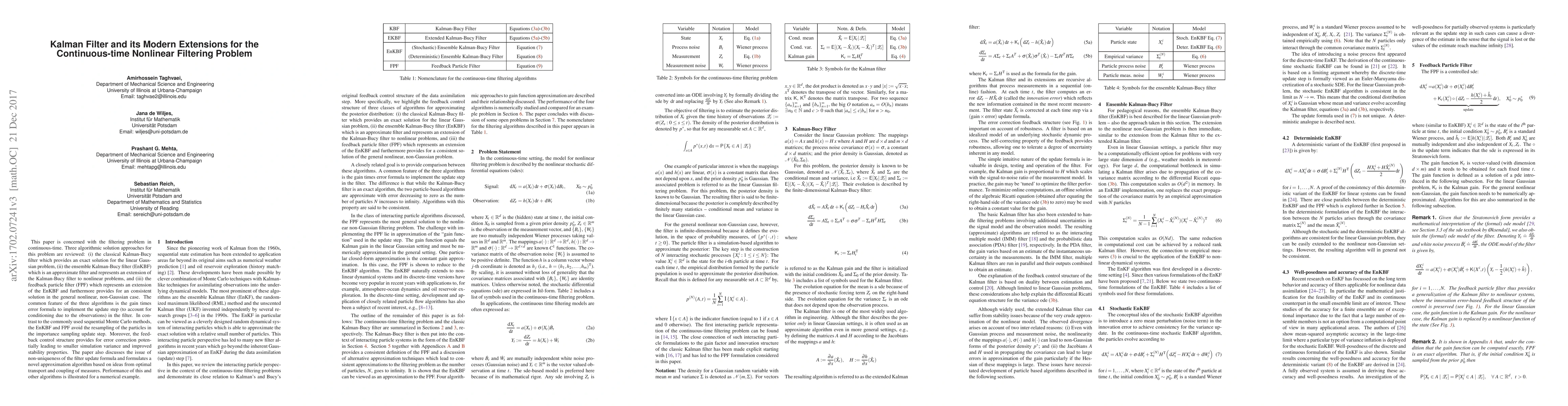 This paper is concerned with the filtering problem in continuous-time. Three algorithmic solution approaches for this problem are reviewed: (i) the classical Kalman-Bucy filter which provides an exact solution for the linear Gaussian problem, (ii) the ensemble Kalman-Bucy filter (EnKBF) which is an approximate filter and represents an extension of the Kalman-Bucy filter to nonlinear problems, and (iii) the feedback particle filter (FPF) which represents an extension of the EnKBF and furthermore provides for an consistent solution in the general nonlinear, non-Gaussian case. The common feature of the three algorithms is the gain times error formula to implement the update step (to account for conditioning due to the observations) in the filter. In contrast to the commonly used sequential Monte Carlo methods, the EnKBF and FPF avoid the resampling of the particles in the importance sampling update step. Moreover, the feedback control structure provides for error correction potentially leading to smaller simulation variance and improved stability properties. The paper also discusses the issue of non-uniqueness of the filter update formula and formulates a novel approximation algorithm based on ideas from optimal transport and coupling of measures. Performance of this and other algorithms is illustrated for a numerical example.