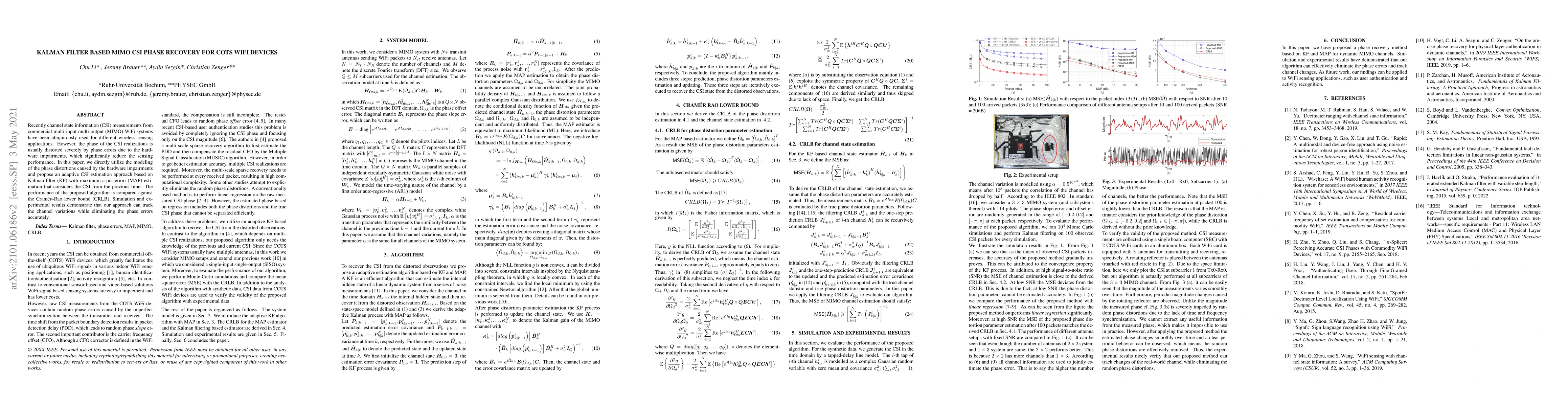 Recently channel state information (CSI) measurements from commercial multi input multi output (MIMO) WiFi systems have been ubiquitously used for different wireless sensing applications. However, the phase of the CSI realizations is usually distorted severely by phase errors due to the hardware impairments, which significantly reduce the sensing performance. In this paper, we directly utilize the modeling of the phase distortions caused by the hardware impairments and propose an adaptive CSI estimation approach based on Kalman filter (KF) with maximum a posteriori (MAP) estimation that considers the CSI from the previous time. The performance of the proposed algorithm is compared against the Cramer Rao lower bound (CRLB). Simulation and experimental results demonstrate that our approach can track the channel variations while eliminating the phase errors accurately.
