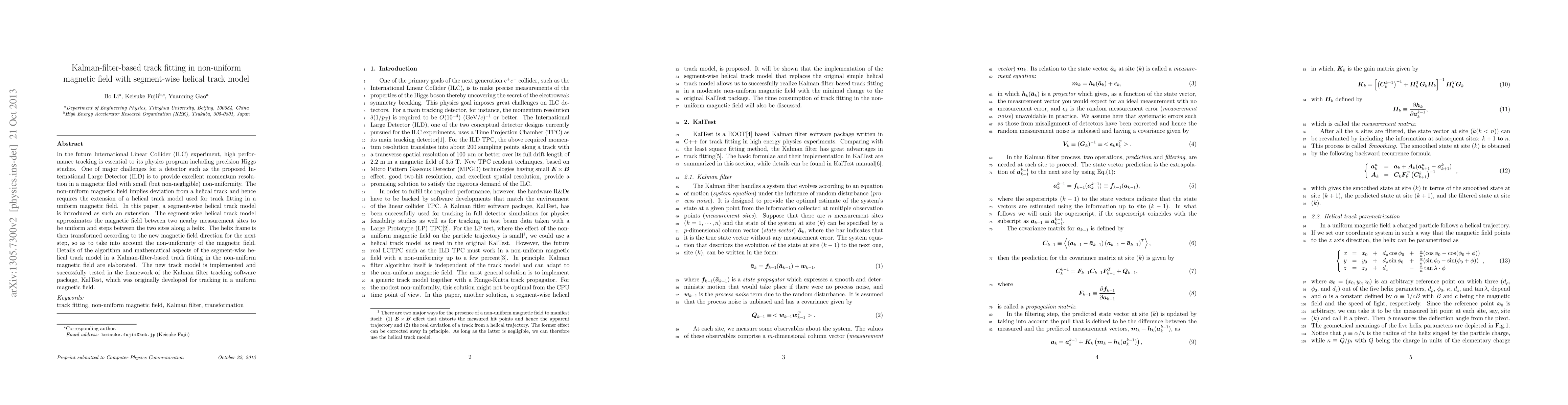 This paper introduces a segment-wise helical track model for track fitting in non-uniform magnetic fields, essential for high-performance tracking in the future International Linear Collider (ILC) experiment. The model approximates the magnetic field as uniform between measurement sites and transforms the helix frame to account for magnetic field non-uniformity, implemented in the Kalman filter tracking software package, KalTest.