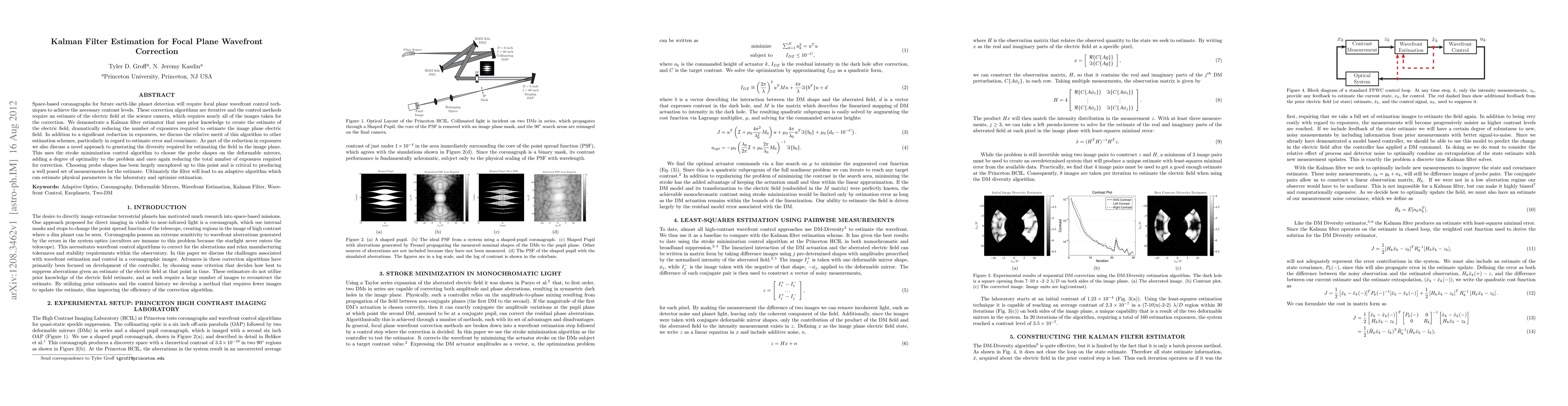 Space-based coronagraphs for future earth-like planet detection will require focal plane wavefront control techniques to achieve the necessary contrast levels. These correction algorithms are iterative and the control methods require an estimate of the electric field at the science camera, which requires nearly all of the images taken for the correction. We demonstrate a Kalman filter estimator that uses prior knowledge to create the estimate of the electric field, dramatically reducing the number of exposures required to estimate the image plane electric field. In addition to a significant reduction in exposures, we discuss the relative merit of this algorithm to other estimation schemes, particularly in regard to estimate error and covariance. As part of the reduction in exposures we also discuss a novel approach to generating the diversity required for estimating the field in the image plane. This uses the stroke minimization control algorithm to choose the probe shapes on the deformable mirrors, adding a degree of optimality to the problem and once again reducing the total number of exposures required for correction. Choosing probe shapes has been largely unexplored up to this point and is critical to producing a well posed set of measurements for the estimate. Ultimately the filter will lead to an adaptive algorithm which can estimate physical parameters in the laboratory and optimize estimation.