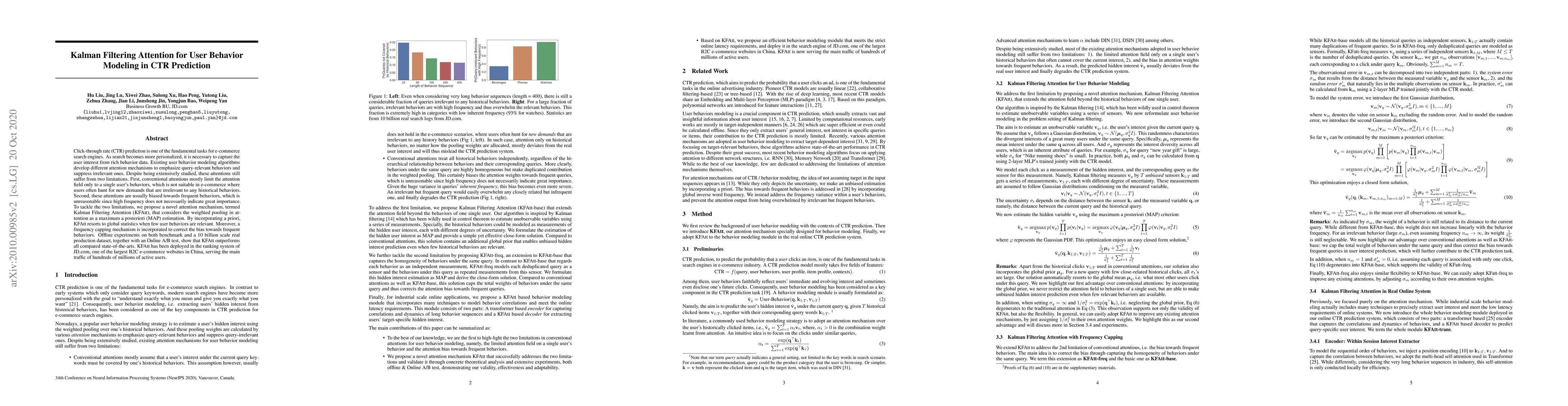 Click-through rate (CTR) prediction is one of the fundamental tasks for e-commerce search engines. As search becomes more personalized, it is necessary to capture the user interest from rich behavior data. Existing user behavior modeling algorithms develop different attention mechanisms to emphasize query-relevant behaviors and suppress irrelevant ones. Despite being extensively studied, these attentions still suffer from two limitations. First, conventional attentions mostly limit the attention field only to a single user's behaviors, which is not suitable in e-commerce where users often hunt for new demands that are irrelevant to any historical behaviors. Second, these attentions are usually biased towards frequent behaviors, which is unreasonable since high frequency does not necessarily indicate great importance. To tackle the two limitations, we propose a novel attention mechanism, termed Kalman Filtering Attention (KFAtt), that considers the weighted pooling in attention as a maximum a posteriori (MAP) estimation. By incorporating a priori, KFAtt resorts to global statistics when few user behaviors are relevant. Moreover, a frequency capping mechanism is incorporated to correct the bias towards frequent behaviors. Offline experiments on both benchmark and a 10 billion scale real production dataset, together with an Online A/B test, show that KFAtt outperforms all compared state-of-the-arts. KFAtt has been deployed in the ranking system of a leading e commerce website, serving the main traffic of hundreds of millions of active users everyday.