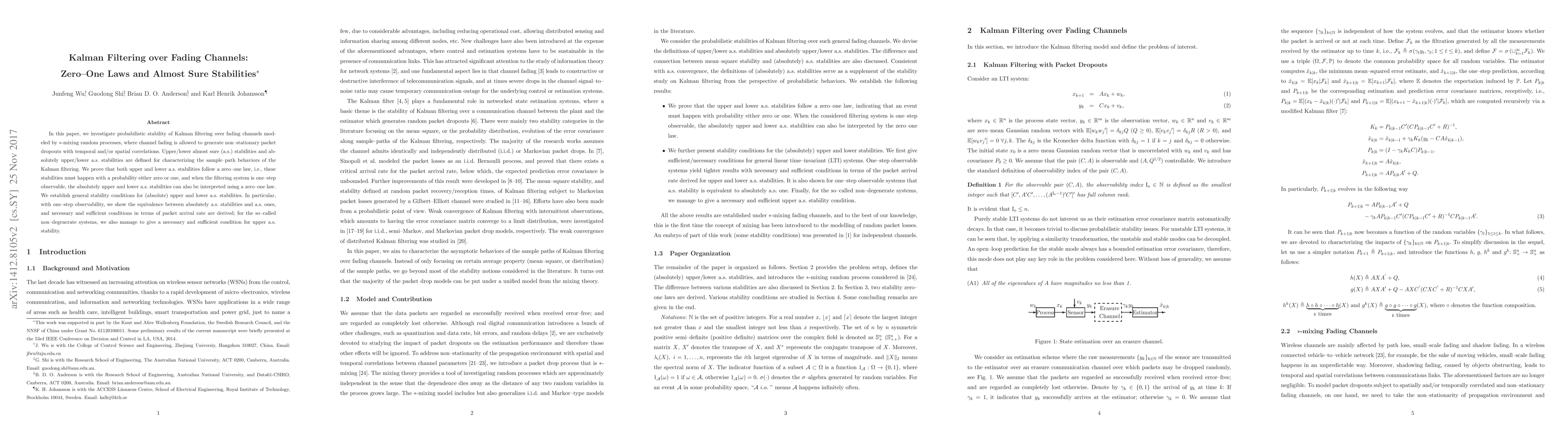 This paper explores the probabilistic stability of Kalman filtering over fading channels with packet dropouts, proving that upper and lower almost sure stabilities follow a zero-one law. It establishes general stability conditions and shows equivalence between absolute and standard almost sure stabilities under one-step observability.