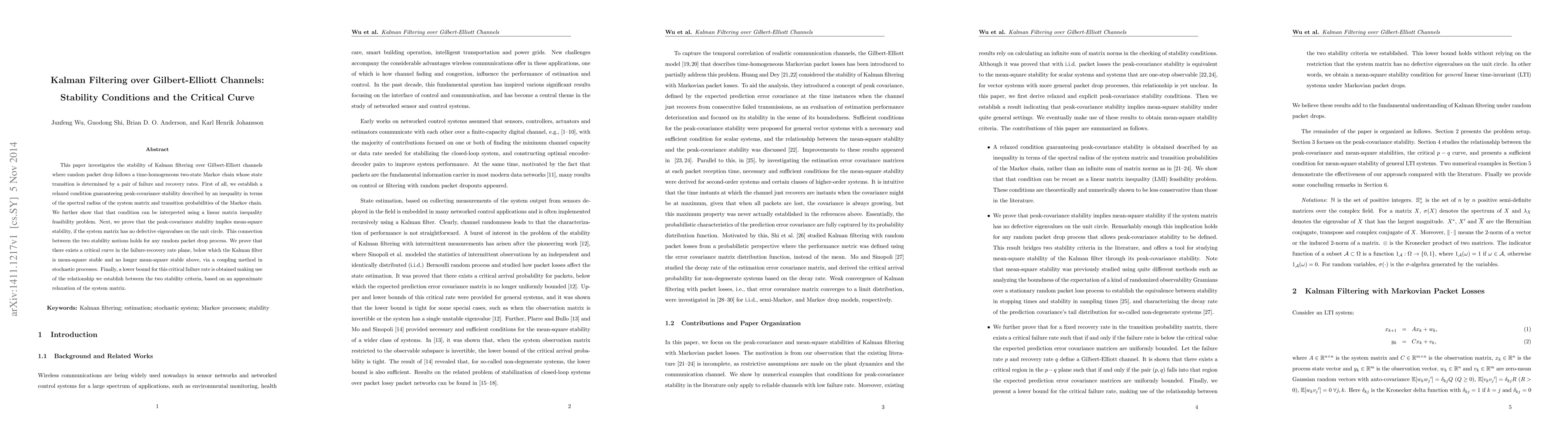This paper examines the stability of Kalman filtering over Gilbert-Elliott channels with packet drops governed by a two-state Markov chain, establishing a condition for peak-covariance stability and proving its equivalence to mean-square stability under certain conditions. It identifies a critical curve in the failure-recovery rate plane that determines the stability threshold of the Kalman filter.