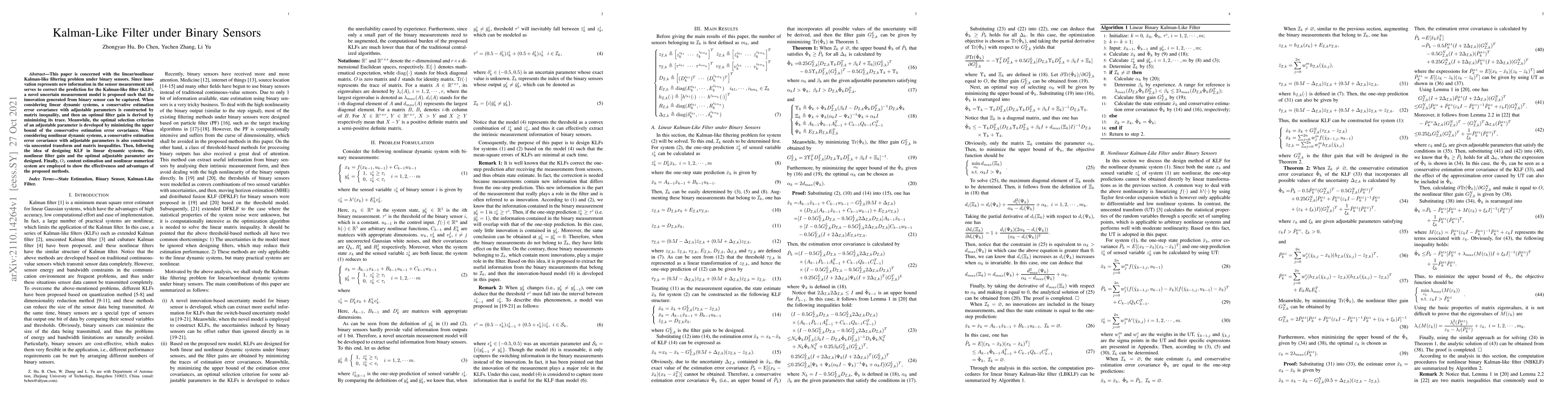 This paper is concerned with the linear/nonlinear Kalman-like filtering problem under binary sensors. Since innovation represents new information in the sensor measurement and serves to correct the prediction for the Kalman-like filter (KLF), a novel uncertain measurement model is proposed such that the innovation generated from binary sensor can be captured. When considering linear dynamic systems, a conservative estimation error covariance with adjustable parameters is constructed by matrix inequality, and then an optimal filter gain is derived by minimizing its trace. Meanwhile, the optimal selection criterion of an adjustable parameter is developed by minimizing the upper bound of the conservative estimation error covariance. When considering nonlinear dynamic systems, a conservative estimation error covariance with adjustable parameters is also constructed via unscented transform and matrix inequalities. Then, following the idea of designing KLF in linear dynamic systems, the nonlinear filter gain and the optimal adjustable parameter are designed. Finally, $O_2$ content estimation and nonlinear numerical system are employed to show the effectiveness and advantages of the proposed methods.
