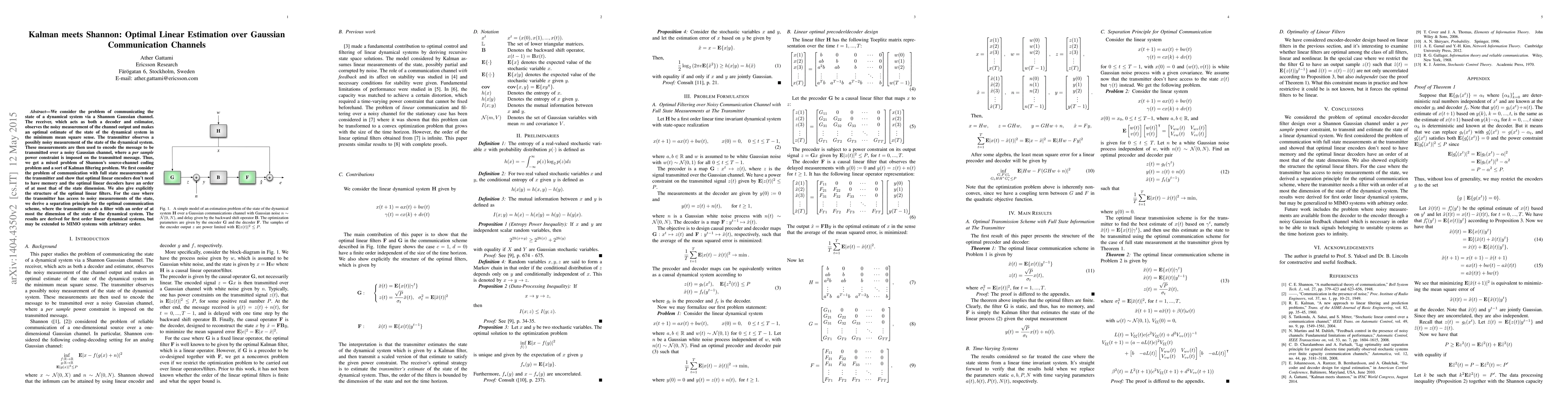This research combines Kalman filtering and Shannon's information theory to optimize communication of a dynamical system's state over a noisy channel. It finds that linear encoders without memory and linear decoders of state dimension order are optimal with full state measurements at the transmitter. For noisy measurements, a separation principle is derived, requiring a state-dimension-order filter at the transmitter. These findings apply to first-order linear systems, extendable to MIMO systems.
