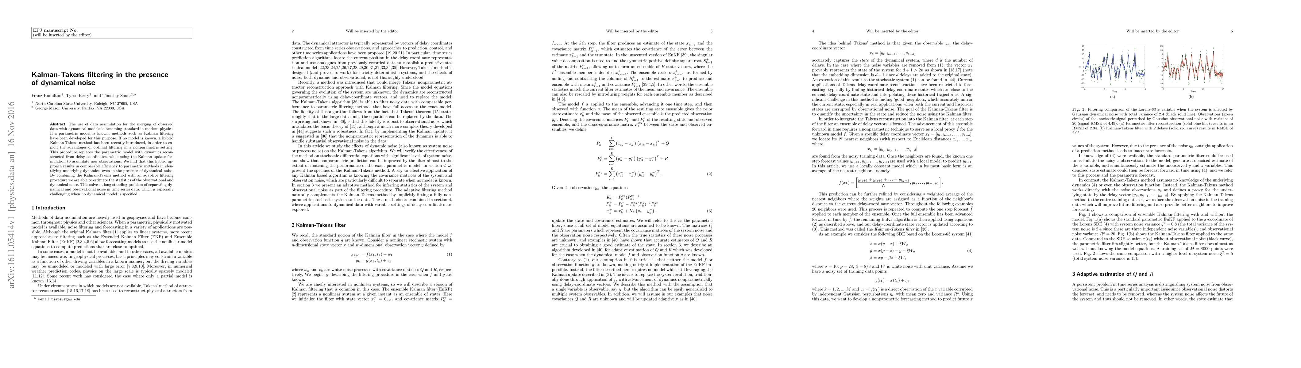 The use of data assimilation for the merging of observed data with dynamical models is becoming standard in modern physics. If a parametric model is known, methods such as Kalman filtering have been developed for this purpose. If no model is known, a hybrid Kalman-Takens method has been recently introduced, in order to exploit the advantages of optimal filtering in a nonparametric setting. This procedure replaces the parametric model with dynamics reconstructed from delay coordinates, while using the Kalman update formulation to assimilate new observations. We find that this hybrid approach results in comparable efficiency to parametric methods in identifying underlying dynamics, even in the presence of dynamical noise. By combining the Kalman-Takens method with an adaptive filtering procedure we are able to estimate the statistics of the observational and dynamical noise. This solves a long standing problem of separating dynamical and observational noise in time series data, which is especially challenging when no dynamical model is specified.