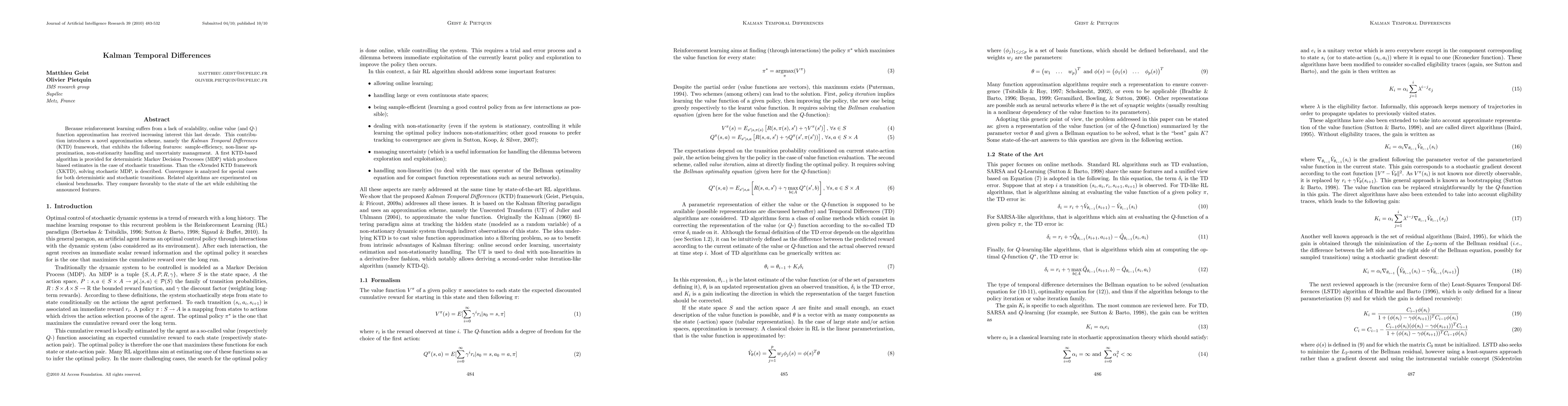 Because reinforcement learning suffers from a lack of scalability, online value (and Q-) function approximation has received increasing interest this last decade. This contribution introduces a novel approximation scheme, namely the Kalman Temporal Differences (KTD) framework, that exhibits the following features: sample-efficiency, non-linear approximation, non-stationarity handling and uncertainty management. A first KTD-based algorithm is provided for deterministic Markov Decision Processes (MDP) which produces biased estimates in the case of stochastic transitions. Than the eXtended KTD framework (XKTD), solving stochastic MDP, is described. Convergence is analyzed for special cases for both deterministic and stochastic transitions. Related algorithms are experimented on classical benchmarks. They compare favorably to the state of the art while exhibiting the announced features.
