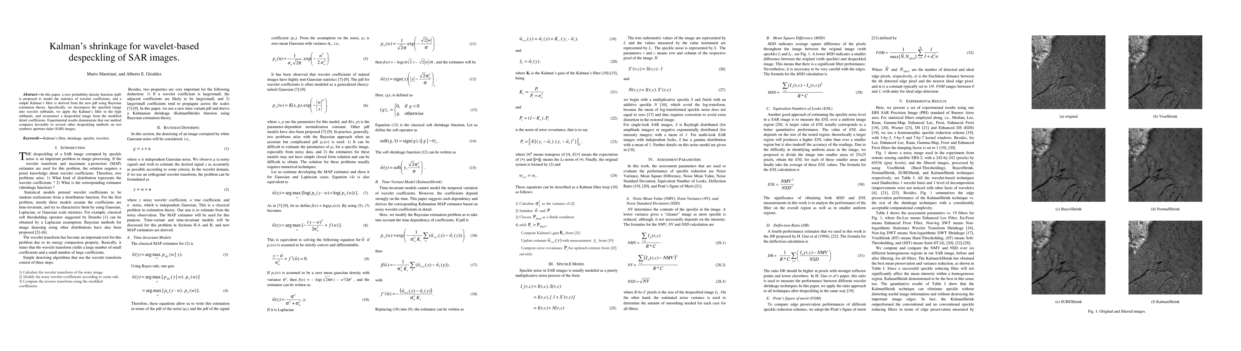 This paper proposes a new probability density function for wavelet coefficients and derives a Kalman filter based on Bayesian estimation to despeckle SAR images. The method outperforms other despeckling techniques in experiments on SAR images.