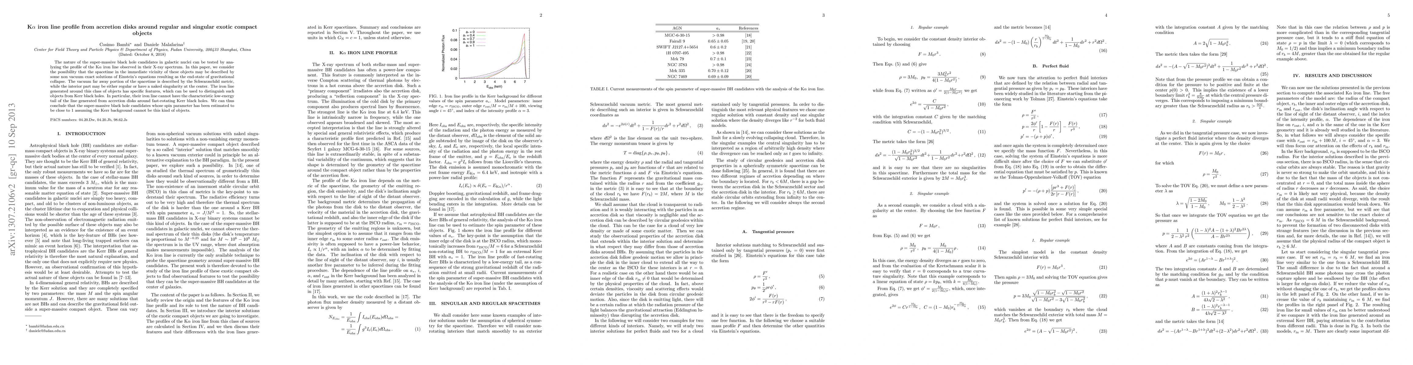 Researchers studied K$eta$ iron line profiles from accretion disks around regular and singular exotic compact objects to distinguish them from Kerr black holes.